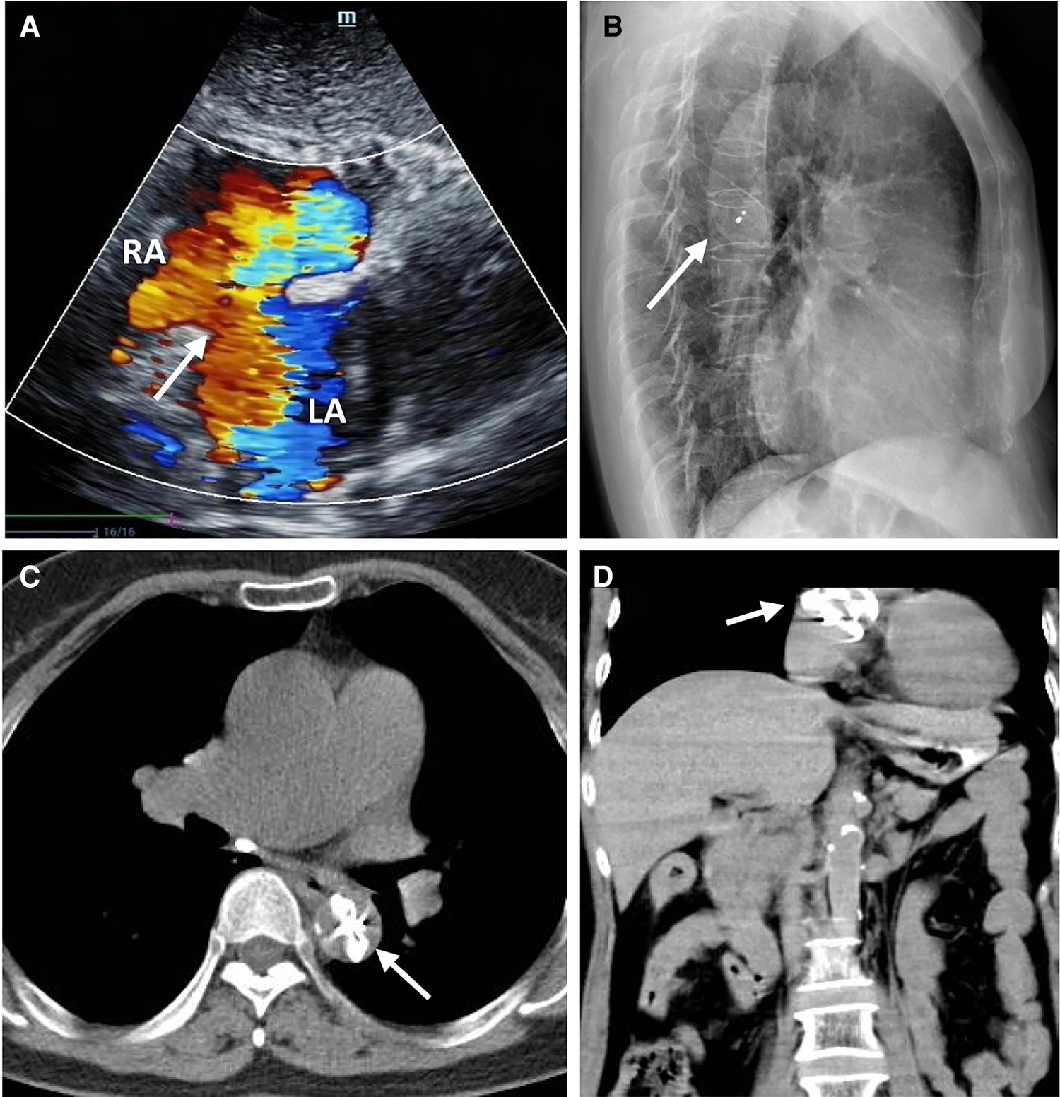 The ASO device embolization. Transthoracic echocardiography showing no occluder device and an interrupted echo (white arrow) in the middle of the atrial septum associated with a large number of left to right shunt flow (A); The lateral chest x-ray showed that the embolized occluder was located in the descending aorta (white arrow) (B); The chest CT showed that the embolized occluder device (white arrow) was located at the descending thoracic aortic isthmus (transverse view, C), (coronal view, D).