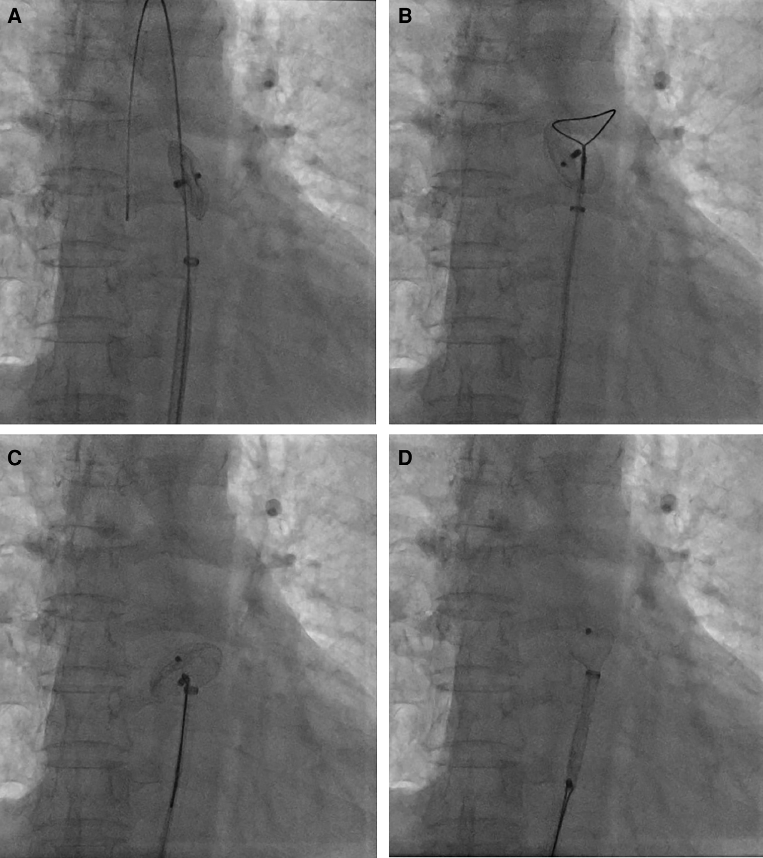 Percutaneous retrieval of the ASO device. Fluoroscopy revealed the embolized ASO device in the descending thoracic aortic isthmus (A); an Amplatz Goose Neck snare was advanced to the near occluder (B); after successful snaring of the screw on right atrial disc of ASO device (C), ASO device was successfully retrieved into the 12-French vascular sheath (D).