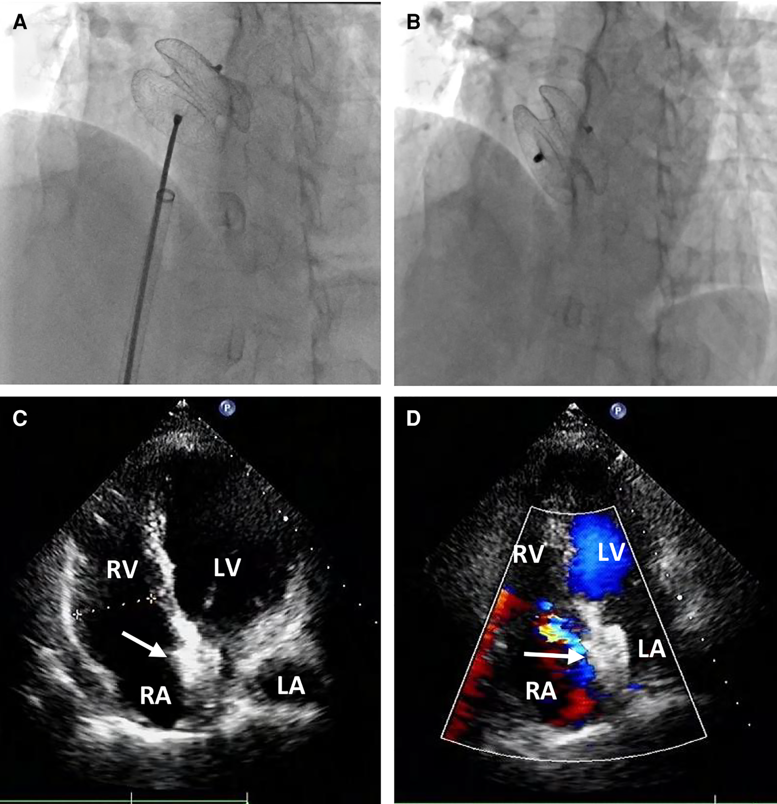 Percutaneous redeployment of the ASO device. Fluoroscopy revealed the 26 mm occluder was sent into the left atrium and the two sides of the occluder were successfully deployed on both sides of the defect (A); the position and shape of the redeployed occluder (white arrow) were found to be optimum, and no residual shunt (B) The occluder was located in the middle of the atrial septum (C) with no residual shunt (D) during the follow-up period.