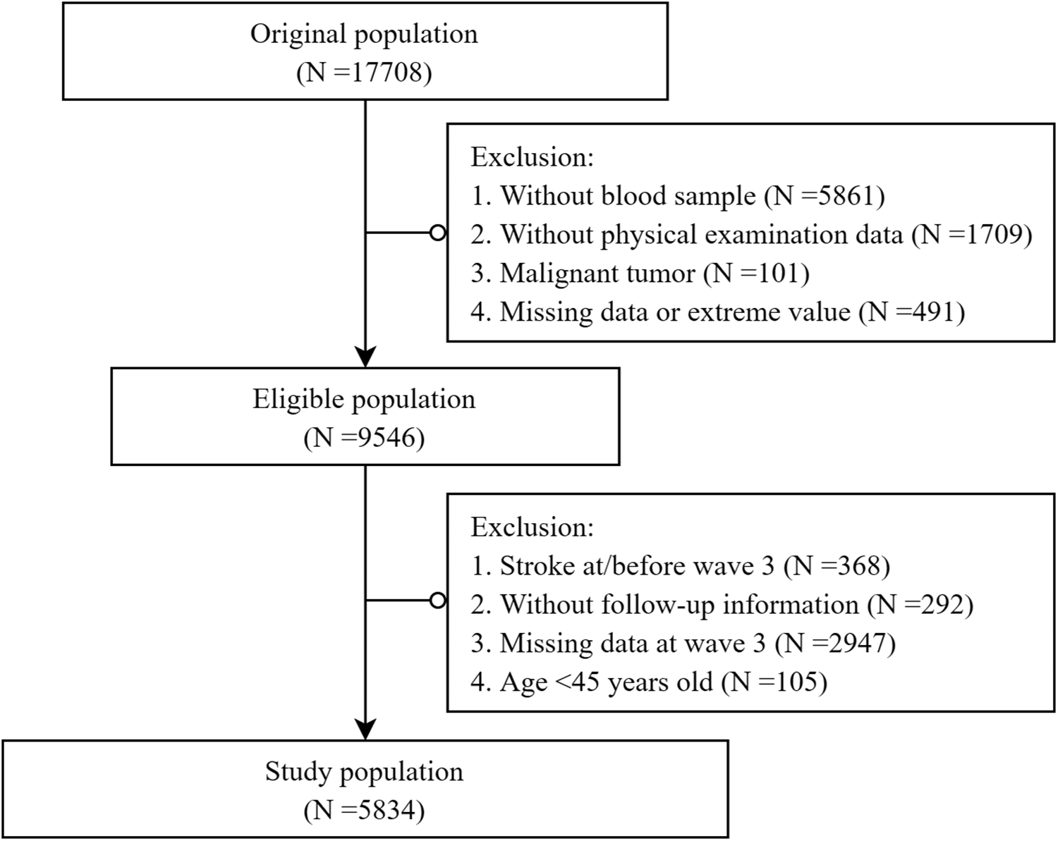 The participants selection process is illustrated in Figure 1. Briefly, 9,546 individuals with complete data were screened for eligibility. For the present study, to evaluate the association between the dynamic change patterns of obesity status and the odds of stroke, those without a blood test at wave 3 were excluded. We also excluded participants who had experienced stroke events before/at wave 3 to minimize potential reverse causality. Finally, 5,834 participants were included (Figure 1). The CHARLS study received approval from the institutional review board of Peking University, and all participants provided written informed consent.