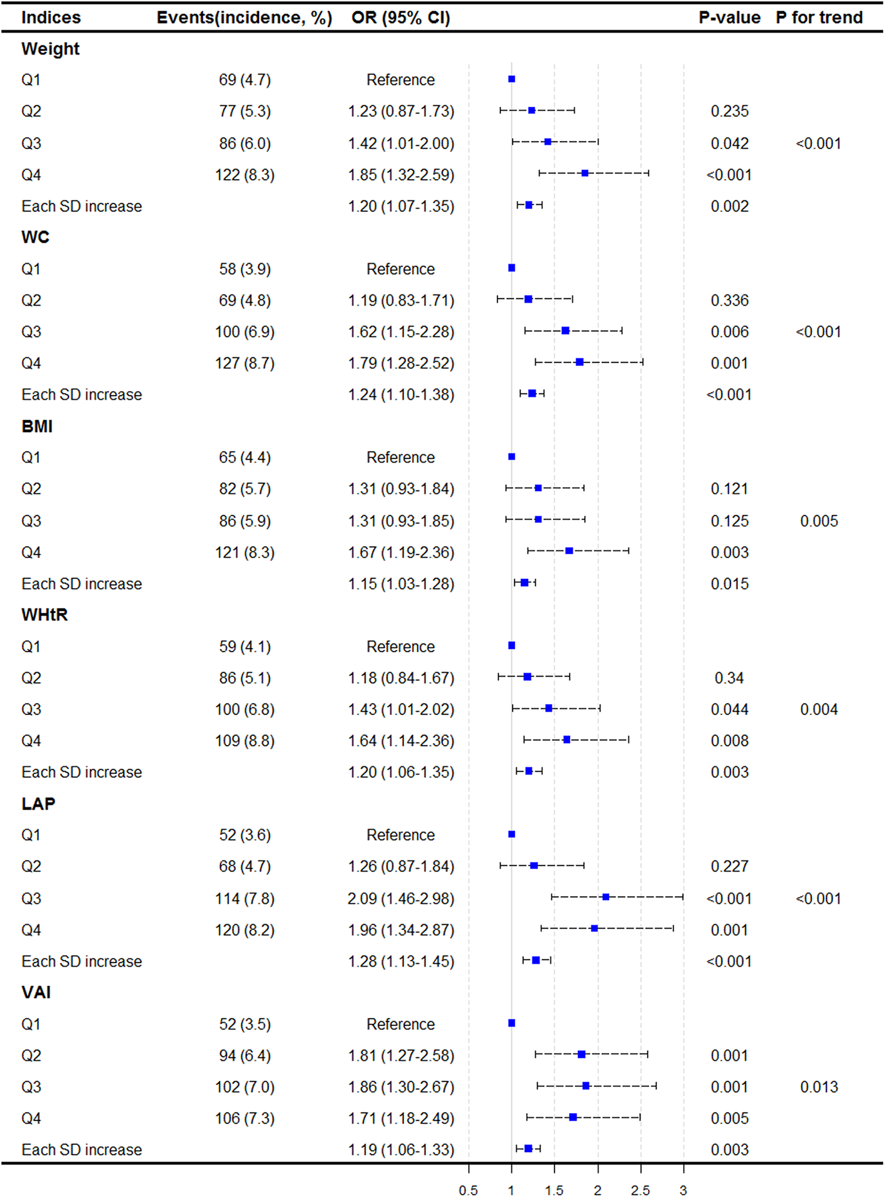 Association between baseline adiposity indices and incident stroke. Results are shown as odds ratios (95% CI) derived from logistic regression models adjusted for age, sex, smoking, drinking, educational levels, SBP, FPG, TC, LDL-C, Scr, UA, hs-CRP, history of hypertension, diabetes, and heart diseases.