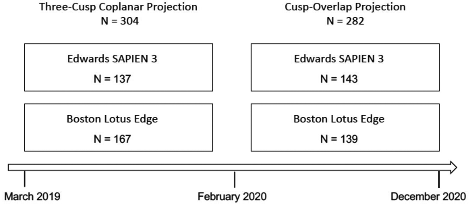 Study design. Between 03/2019 and 12/2020 consecutive patients without permanent pacemaker or implantable cardioverter defibrillator undergoing native valve transcatheter aortic valve replacement (TAVR) were included in the study. Prior to 02/2020 TAVR was performed in a three-cusp coplanar projection, and subsequently in a cusp-overlap projection.