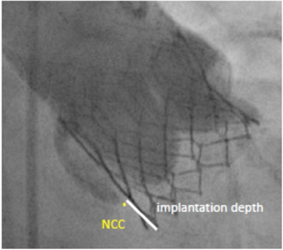 Conduction disturbances demanding permanent pacemaker implantation (PPI) remain a common complication after transcatheter aortic valve replacement (TAVR). Optimization of the implantation depth (ID) by introducing the cusp-overlap projection (COP) technique led to a reduced rate of PPI when self-expanding valves were used.