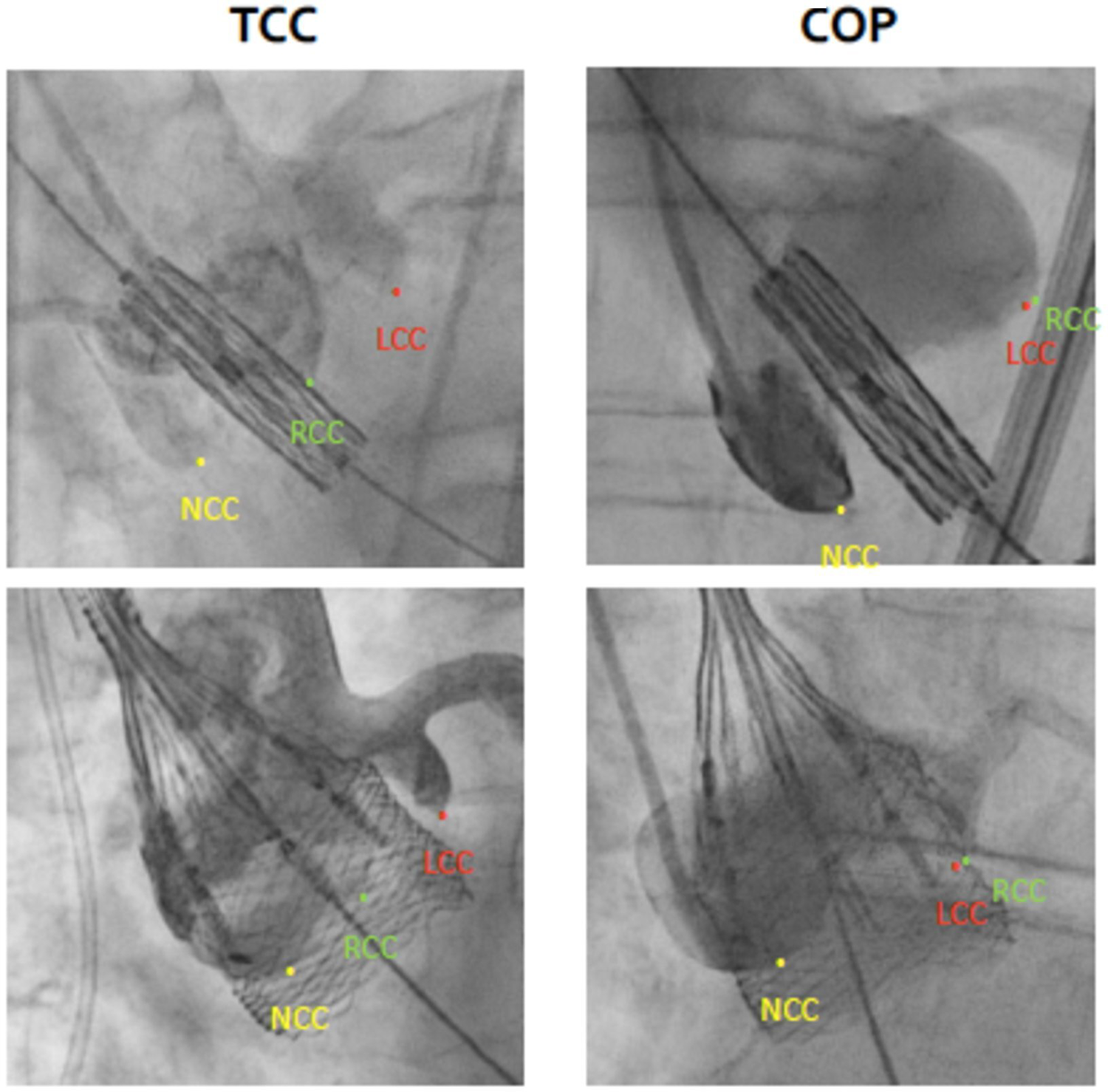 Primary clinical outcomes were new-onset of LBBB and PPI rates following TAVR as well as the measurement of ID comparing valve deployment with COP and TCC view. Furthermore, safety outcomes including device embolization, need for second valve implantation, coronary artery obstruction as well as moderate or severe aortic insufficiency post procedure were analyzed.