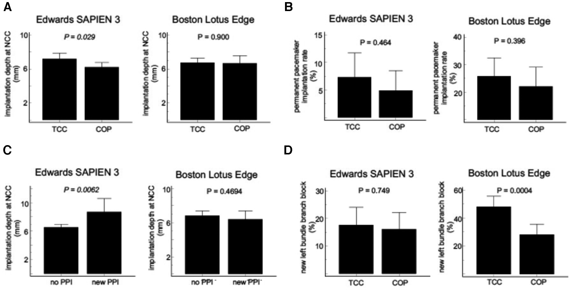 Comparison of cusp overlap projection (COP) and tricuspid coplanar projection (TCC) for TAVR with Edwards SAPIEN 3 and Boston LOTUS Edge valves. (A) implantation depth, (B) new permanent pacemaker implantation (PPI) rate, (C) implantation depth in patients with or without new PPI, (D) incidence of new-onset of left bundle branch block (LBBB).