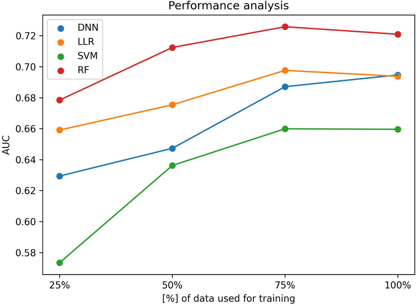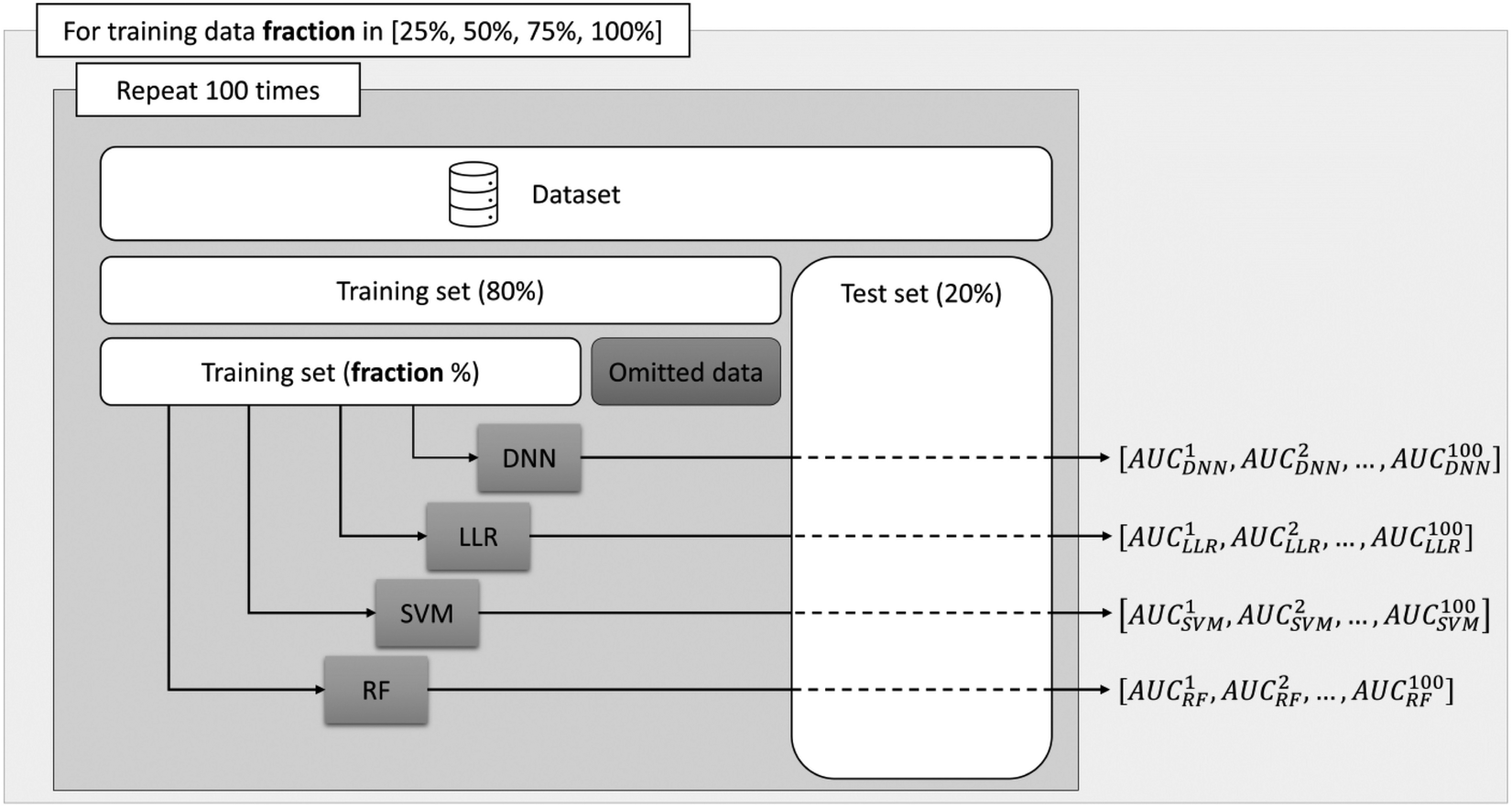 First, for each experiment a random train-test split was performed designating 20% of the available samples as an evaluation set. Next, from the remaining 80% of the data allocated to the training set, we randomly select 25%, 50%, 75% and 100% of the samples to train a Random Forest (RF) model (20), a support vector machines (SVM) model (21), a simple linear logistic regression (LLR) and a deep neural network (DNN). To reduce potential biases stemming from the data, we repeated each experiment 100 times with different random splits and store the area under the receiver operating characteristic curve (AUC) for the binary classification problem. This allowed us to assess the performance of the ML algorithms more accurately, by computing the mean of the AUC scores obtained across the experiments, as well as to assess the performance trend with respect to the number of training examples.