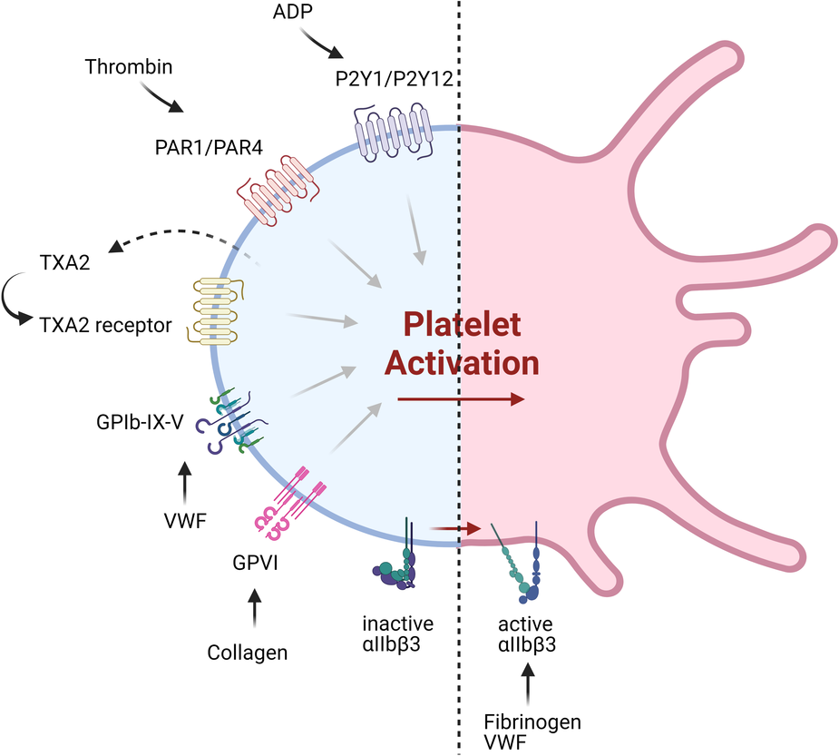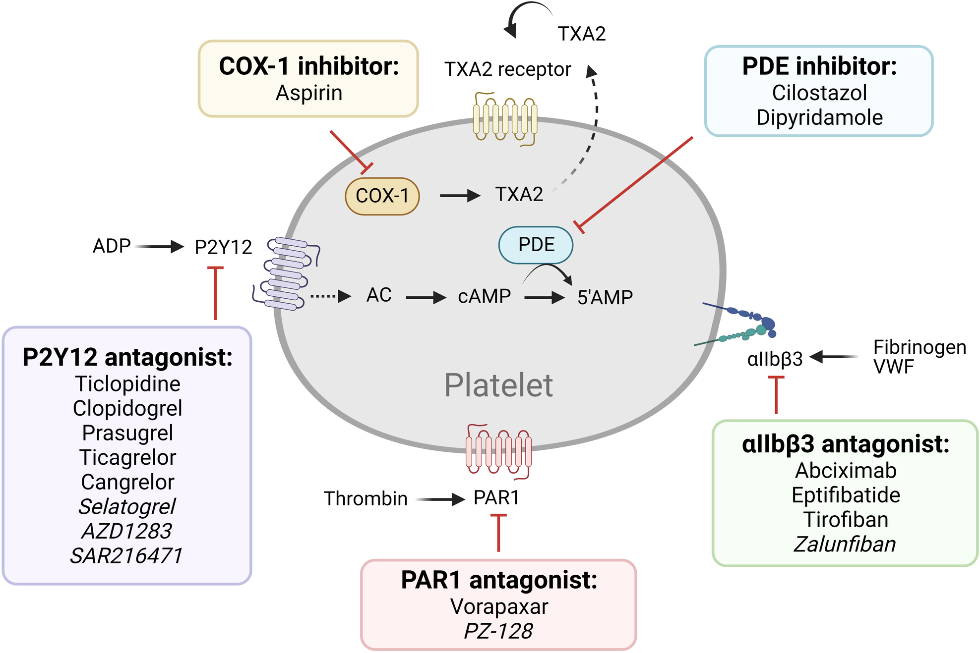 Antiplatelet therapy has become a fundamental component in the treatment of cardiovascular disease. At the site of vascular injury or in response to vascular pathology, such as rupture of an atherosclerotic plaque, platelets can activate and aggregate intravascularly, typically as arterial thrombi (1). Similarly, platelet activation and aggregation are associated with inflammatory conditions, and platelet depletion with the development of disseminated intravascular coagulopathy, in conditions such as sepsis (3). Antiplatelet drugs are intended to prevent or limit platelet activation and aggregation and are generally used in acute coronary syndrome (ACS) and ischemic stroke patients for long-term control or secondary prevention (4–7). As the same mechanistic processes are responsible for both physiological and pathological platelet aggregation, striking a balance between the beneficial and harmful effects of antiplatelet therapy continues to be a challenge. In practice, this is clinically managed by careful consideration of optimal therapeutic regimens and duration of therapy, while prioritizing treatment for patients whose thrombotic risk clearly outweighs their risk of bleeding complications. In this section, we discuss the existing and recently developed antiplatelet therapeutics, along with novel strategies that have been proposed based on animal studies.