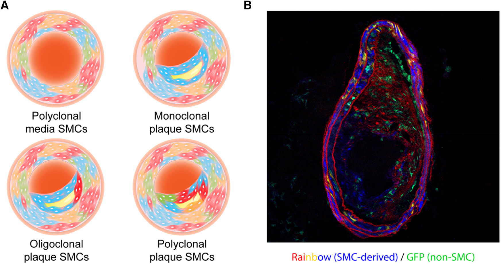 (A) illustration of the clonality patterns that have been observed in various studies. The vascular smooth muscle cells (SMCs) in the tunica media exist in a polyclonal manner, while plaque SMCs can show a monoclonal, oligoclonal, or polyclonal pattern depending on environmental cues. (B) A representative cross-sectional image of an atherosclerotic vessel from a male Myh11-CreERT2, ROSA26R- Rainbow, Apoe−/− mouse. This mouse carried a “multi-color” Rainbow reporter that constitutively expressing GFP. After being injected with tamoxifen to activate Cre recombinase in Myh11-expressing cells, this mouse was fed with a high-fat diet. These Myh11-expressing cells and their progeny were randomly labeled with one of the Rainbow colors (Cerulean, mOrange, or mCherry).
