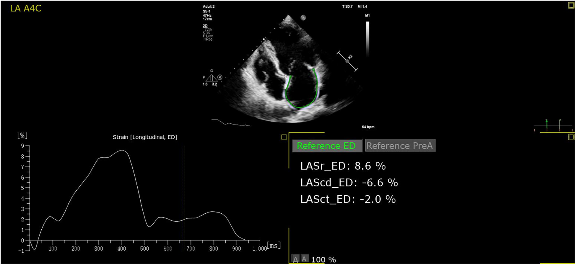 The auto strain LA algorithm acquires the LA strain parameters at both end-diastole automatically. LASr, LASreservoir; LAScd, LASconduit; LASct, LASpump.