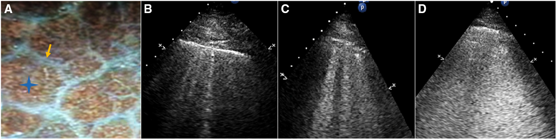 (A) Gross anatomy of the lung surface: the white line pointed by the yellow arrow is the subpleural interlobular septum which is approximately 7 mm apart. The blue star indicates the location of the alveoli. (B) Septal syndrome: B-lines are approximately 7 mm apart, corresponding to subpleural interlobular septa. (C) Interstitial-alveolar syndrome: B-lines are confluent. (D) White lung. B-lines have coalesced, resulting in an almost completely white echographic image.