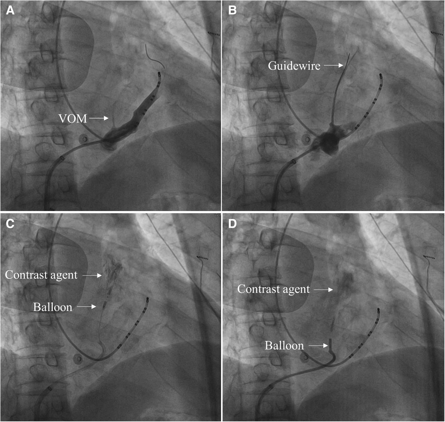 The primary process of the VOM-EI procedure in 30° right anterior oblique views. (A) CS vein angiography showed VOM (Arrow indicates the VOM). (B) A guidewire was advanced to the distal end of the VOM (Arrow indicates the guidewire). (C) After the balloon was dilated at the distal end of the VOM and injected with anhydrous ethanol, local myocardial staining was observed (Arrow indicates the dilated balloon at the distal end of the VOM and the myocardium stained with a contrast agent, respectively). (D) After the balloon was dilated at the proximal end of the VOM and injected with anhydrous ethanol, local myocardial staining was observed (Arrow indicates the dilated balloon at the proximal end of the VOM and the myocardium stained with a contrast agent, respectively).