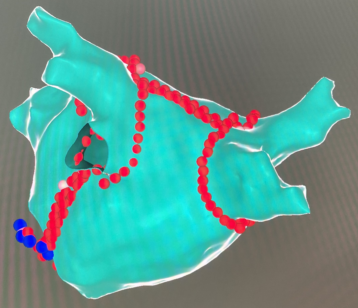 A typical LA electroanatomical map after CPVA and linear ablation in posterior-anterior views. The red dots indicate the site of endocardial ablation, and the blue dots indicate the site of CS vein ablation.
