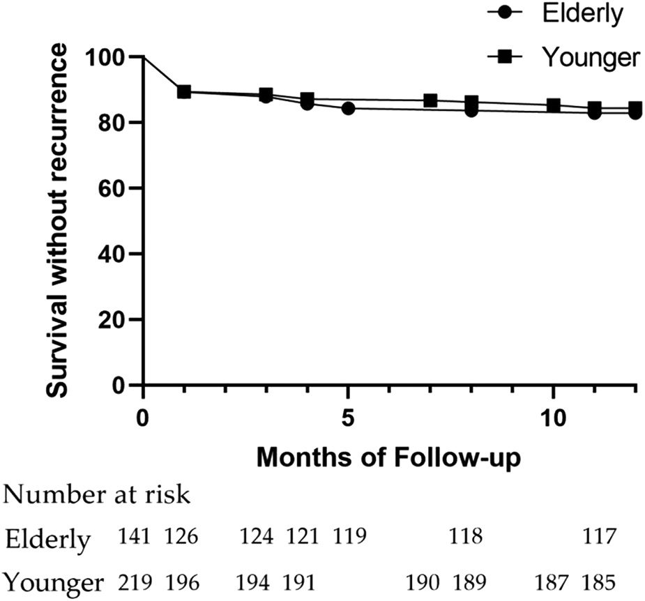 The VOM-EI was successfully performed in 90.8% of patients from the Elder and 88.6% from the Younger group. All patients achieved PVI; 97.9% of patients from the Elder and 98.6% from the Younger group reached LA roof block, and 93.6% of patients from the Elder and 95.9% from the Younger group achieved MI block. There was no significant difference in 1-year survival without recurrence of AF between the two groups (83.0% and 84.5%, respectively). The incidence of complications within 30 days after the procedure from the two groups was low and did not differ significantly.