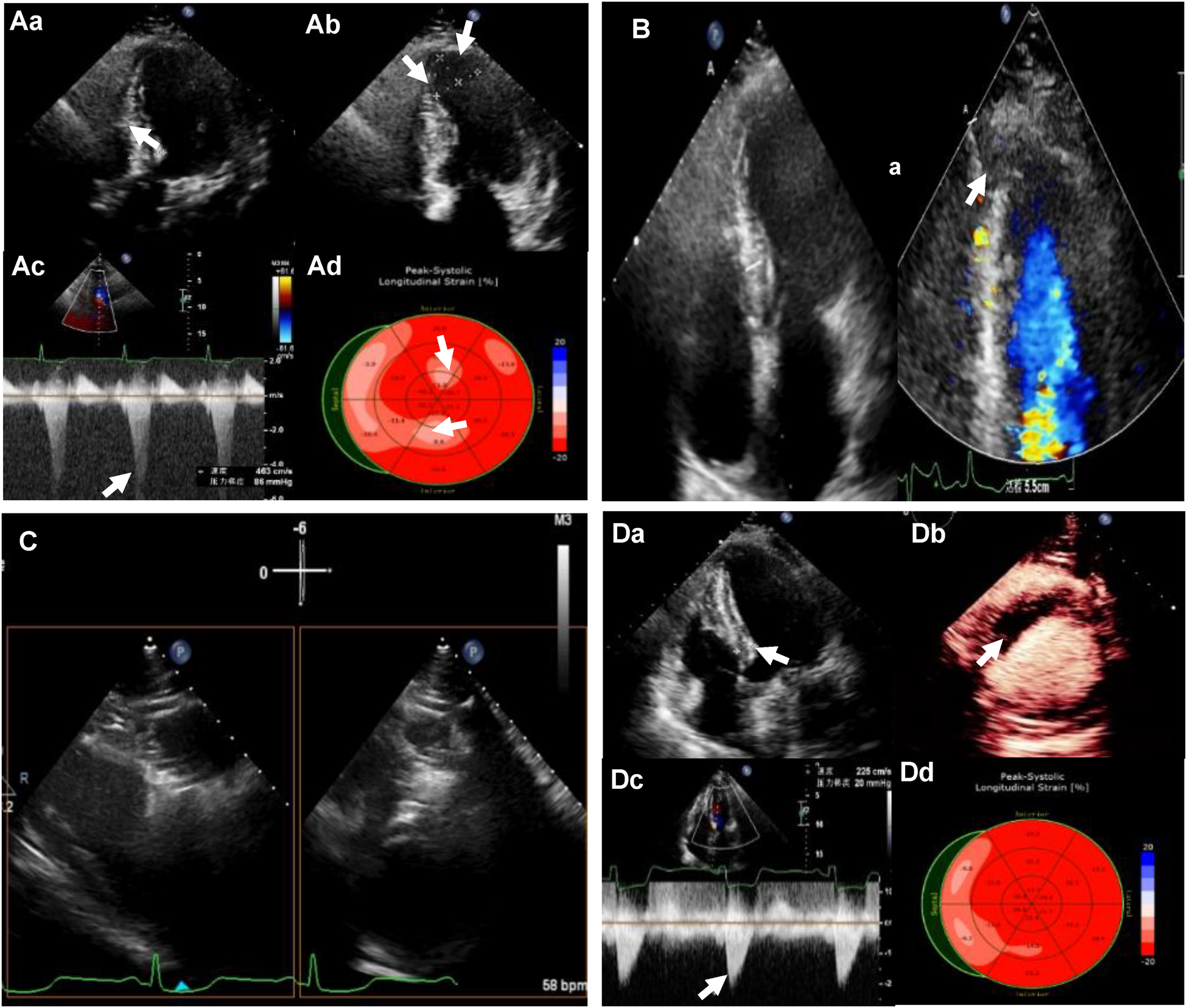 (Aa) Preoperative transthoracic echocardiography (TTE): left ventricular (LV) septal thickness of 20mm; (Ab) the extent of ventricular aneurysm; (Ac) left ventricular outflow tract (LVOT) obstruction at rest; (Ad) reduced strain value of local LV apex by strain echocardiography (SE). (B) LV apical entrance of the ablation needle guided by TTE. (C) Bi-plane showing ablation needle position. (Da) LV septal thickness of 12 mm after ablation; (Db) myocardial contrast-enhanced echocardiography (MCE) showing a contrast filling defect in the ablation zone; (Dc) LVOT gradient of 20 mm Hg after the ablation; (Dd) LV apical systolic synchrony detected by SE.