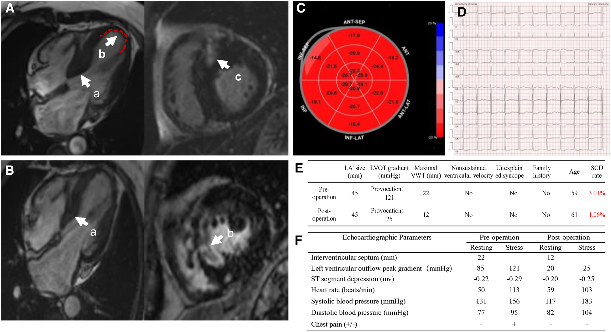 (A) Preoperational cardiac magnetic resonance imaging (MRI). (a) Thickened interventricular septum, (b) the extent of ventricular aneurysm, (c) myocardial interstitial fibrosis; (B) post-operational cardiac MRI. (a) Interventricular septal thickness, (b) hypoperfusion area of myocardium at the base of ventricular septum; (C) recovered strain values of local LV apex post-operation; (D) electrocardiogram post-operation; (E) sudden cardiac death score pre- and post-operation; (F) stress echocardiographic parameters of pre- and post-operation.