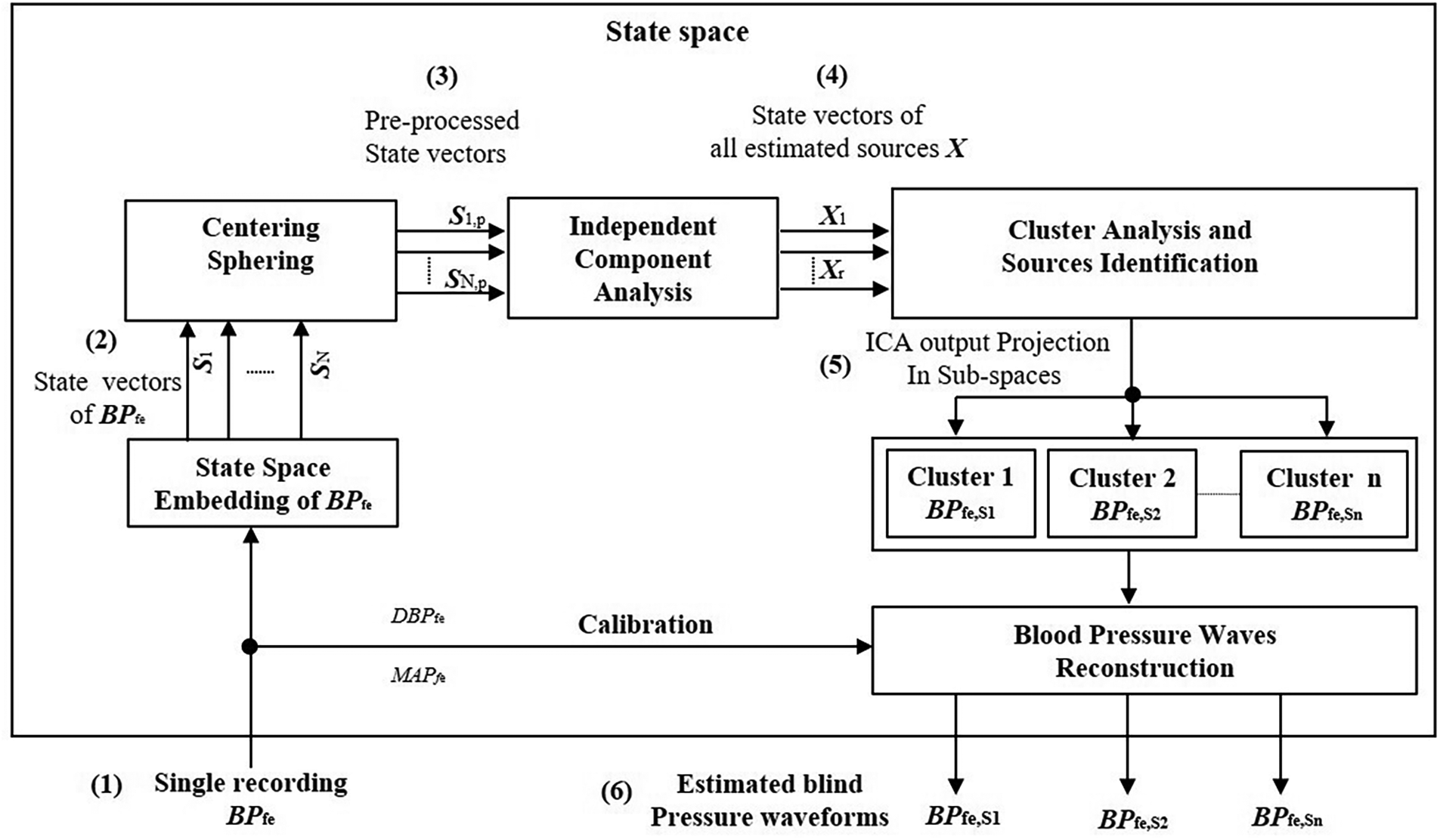 Principle of the decomposition of the single recording of the intra-arterial blood pressure waveform at femoral artery BPfe by the SCICA: (1) single recording of BPfe as input signal for the SCICA; (2) non-linear embedding of the BPfe in state space using the method of delay and reconstruction of time-delayed m-dimensional state vectors (Si, for i = 1, …, N) that capture the similar dynamics as in BPfe; (3) centering and whitening of state vectors (Si,p, for i = 1, …, N) of BPfe as multi-channel input for the standard independent component analysis algorithm in state space; (4) time-delayed state vectors of all estimated independent compounds X that lie in independent subspaces; (5) clustering of the mixing matrix basis that span the independent subspaces of the blind pressure sources and projection of X in these independent subspaces. Each cluster of state vectors lie in an independent subspace and corresponds to an estimated blind source that contribute to the dynamic in the BPfe; and (6) reconstructed sources in time domain by averaging time-delayed state vectors of the extracted sources and calibration of pressure waveforms with the mean and diastolic blood pressure of BPfe.