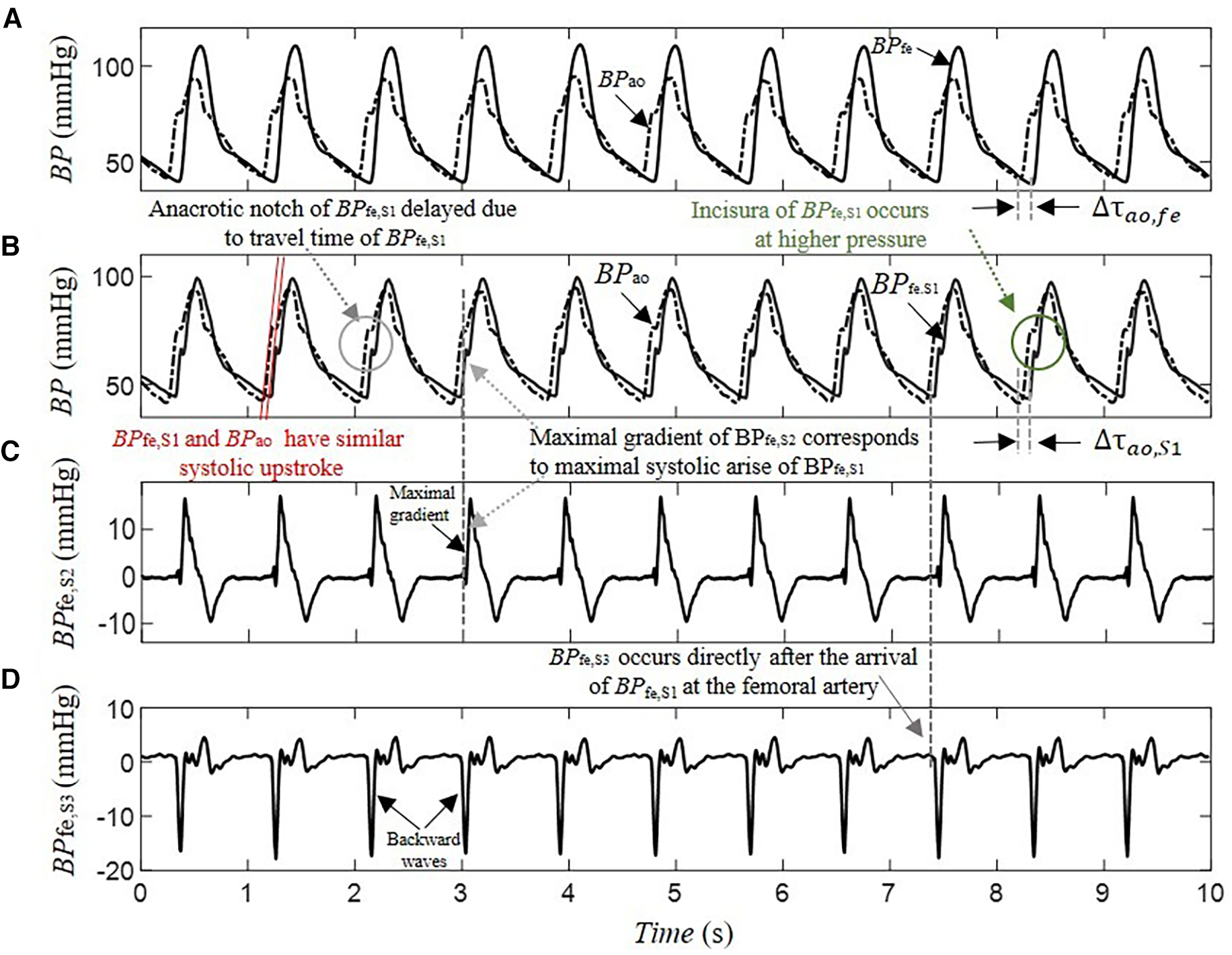 BP fe,S1 and BPao arise with similar systolic upstroke, as shown in Figure 3B. After closure of the aortic valve, BPao and BPS1,fe decrease to the baseline levels at the end diastole with nearly similar exponential diastolic decay. The time delay Δτao,S1 between BPfe,S1 and BPao is close to the time delay Δτao,fe between the measured BPfe and BPao that corresponds to the transit time of the pressure wave from the ascending aorta to the femoral artery. Moreover, the pressure wave activity of BPfe,S2 and BPfe,S3 during diastole was minimal and very close to zero, matching the diastolic flow. BPfe,S1 was the main driver of the exponential pressure fall-off in diastole in all patient recordings.