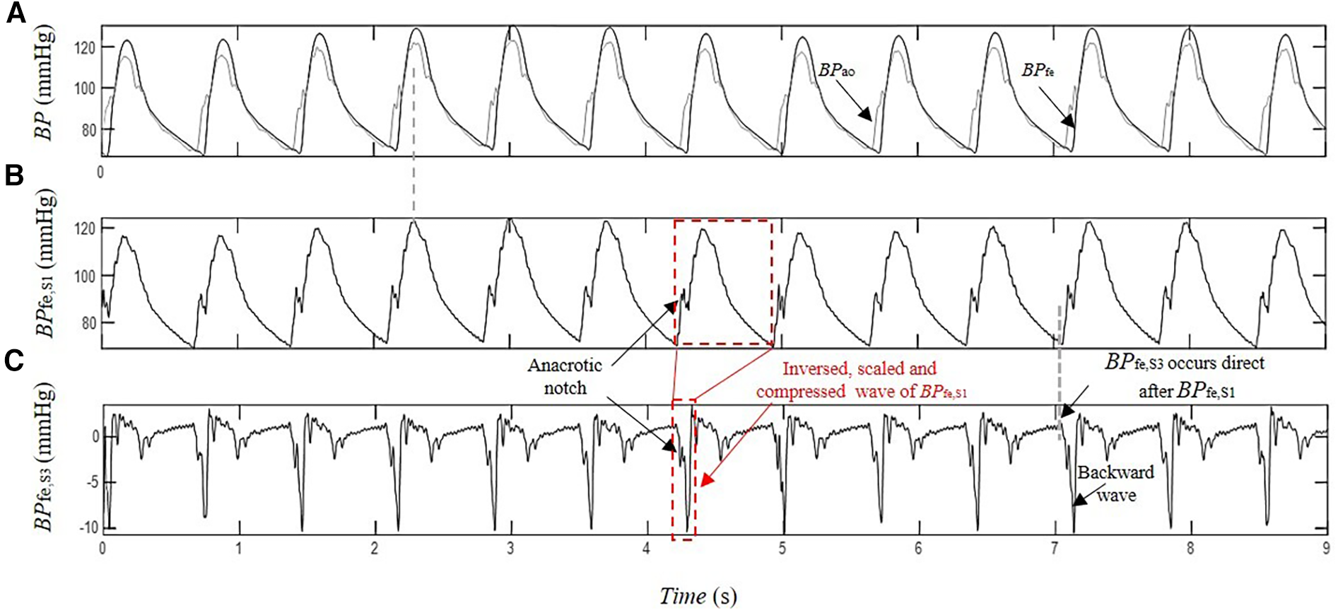 Estimation of the contribution of the pressure wave reflection by SCICA: (A) recorded intra-arterial blood pressure at the femoral artery BPfe (black) and blood pressure at the ascending aorta BPao (gray) during coronary artery surgery; (B) first estimated pressure waveform BPfe,S1 with similar morphological and time characteristics such as BPao; and (C) the third extracted pressure waveform BPfe,S3 has the minimal contribution to the recorded BPfe. The first backward wavelet of BPfe,S3 occurs directly after the arrival of BPfe,S1 at the femoral artery. It has an inversed, scaled, and compressed form of the BPfe,S1 that may correspond to a local reflection of BPfe,S1 at the femoral artery. The other wavelets contributing to BPfe,S3 morphology occur in the systole and early diastole The late diastolic part of BPfe,S3 is nearly wave free.