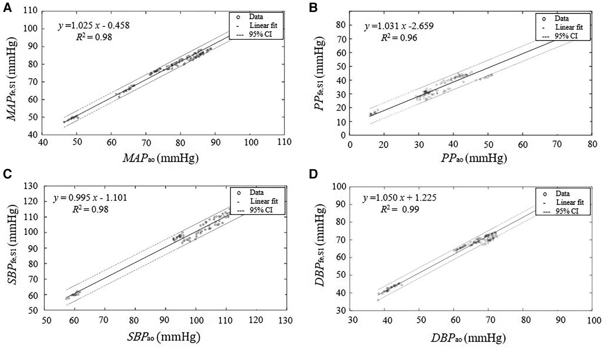 Linear regression between the parameters derived from the estimated central pressure BPfe,S1 from the pressure recording at the femoral artery BPfe by SCICA and the central parameters derived from the intra-aortic pressure BPao. The solid lines represent the regression lines of best fit and the dashed lines represent 95% confidence intervals (95% CI) for the regression lines. The regression analysis shows a strong linear relationship between the estimated central indices by SCICA and intra-aortic indices: (A) MAPfe,S1 and MAPao, (B) SBPfe,S1 and SBPao, (C) DBPfe,S1 and DBPao, and (D) PPfe,S1 and PPao with very high coefficients of determination R2 of 0.98, 0.98, 0.99, and 0.96, respectively.