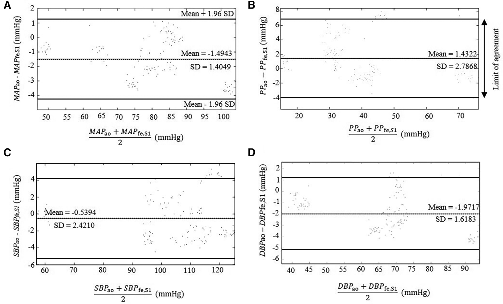 Bland–Altman plots comparing the estimated parameters derived from the extracted BPfe,S1 from the intra-artery BPfe using SCICA with the intra-aortic parameters derived from intra-aortic BPao: (A) MAP, (B) PP, (C) SBP, and (D) DBP. The dotted lines show the mean difference between the reference and estimated measurements. The 95% limits of agreement are represented with bold lines and are computed as the mean difference plus or minus 1.96 times of its standard deviation SD: mean − 1.96 SD and mean + 1.96 SD. Bland–Altman plots show a good agreement between the estimated central parameters by SCICA and the intra-aortic features because 95% of mean differences points lie within the limit of agreements.