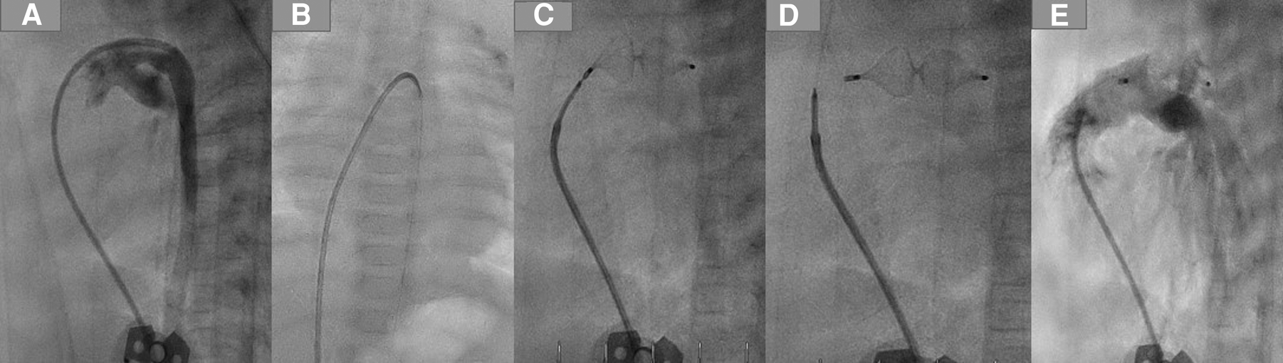 PDA closure with AP4 step by step. (A) Demonstrating the duct using a 4 F JR, which crossed the duct and was positioned in the descending aorta. (B) A 0.14 coronary wire was positionedin the DAO. (C) Plug 8/13.5 was employed in the duct. (D) Removing the delivery wire from the plug. (E) Angiography after the intervention, no residual shunt.