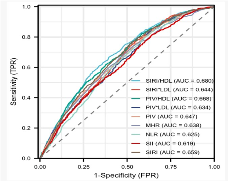 PIV = [neutrophil count (×109/L) × platelet count (×109/L) ×  monocyte count (×109/L)/lymphocyte count (×109/L)]; SIRI = [neutrophil count (×109/L) ×  monocyte count (×109/L)/lymphocyte count (×109/L)]; SII = [neutrophil count (×109/L) ×  platelet count (×109/L)/lymphocyte count (×109/L)]; MHR = monocyte to high-density lipoprotein cholesterol ratio; NLR = neutrophil to lymphocyte ratio; SIRI/HDL = [SIRI/high-density lipoprotein cholesterol count(mmol/L)]; SIRI × LDL = [SIRI × low-density lipoprotein cholesterol count(mmol/L)]; PIV/HDL = [PIV/high-density lipoprotein cholesterol count(mmol/L)]; PIV × LDL = [PIV × low-density lipoprotein cholesterol count(mmol/L)].