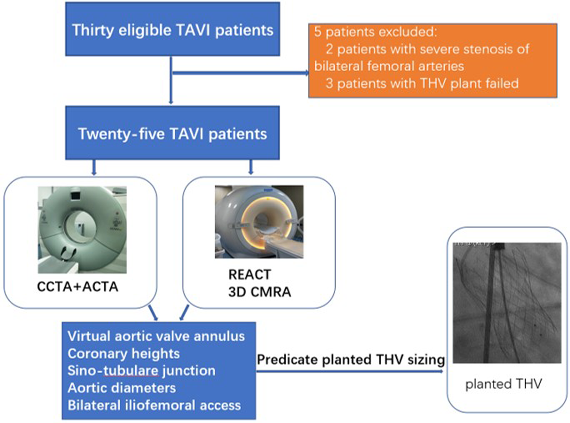 CTA and cardiovascular MRI examinations were successfully completed for all 30 patients. Of these, 25 patients successfully underwent TAVI (14 women, average age: 68 ± 7 years), including 23 and two who received self-expandable THVs and balloon-expandable THVs, respectively. Five patients were excluded, including two with severe stenosis of bilateral femoral arteries and three with failed THV implantation. The study workflow is shown in Figure 1. All patients had no allergic reaction to the CTA contrast agent. Patients’ characteristics are summarized in Table 1.