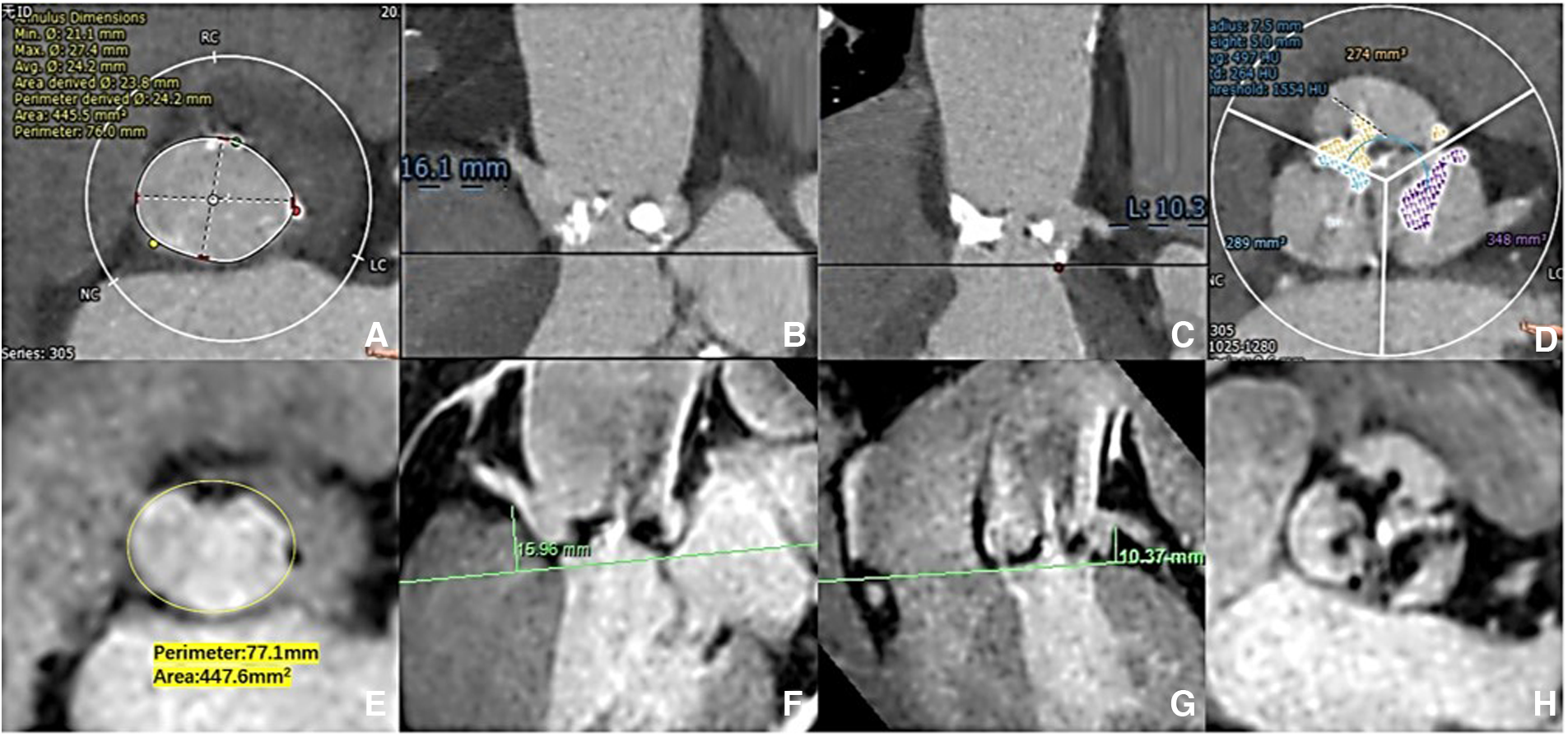 Aortic root measurement: CCTA vs. 3D whole-heart MRI. The aortic ring dimensions were assessed [(A) CCTA vs. (E) 3D whole-heart MRI]. The right/left coronary ostial heights were measured perpendicular to the annulus plane [(B,C) CCTA: vs. (F,G) 3D whole-heart MRI]. The extent of valve calcification was assessed [(D) CCTA vs. (H) 3D whole-heart MRI).