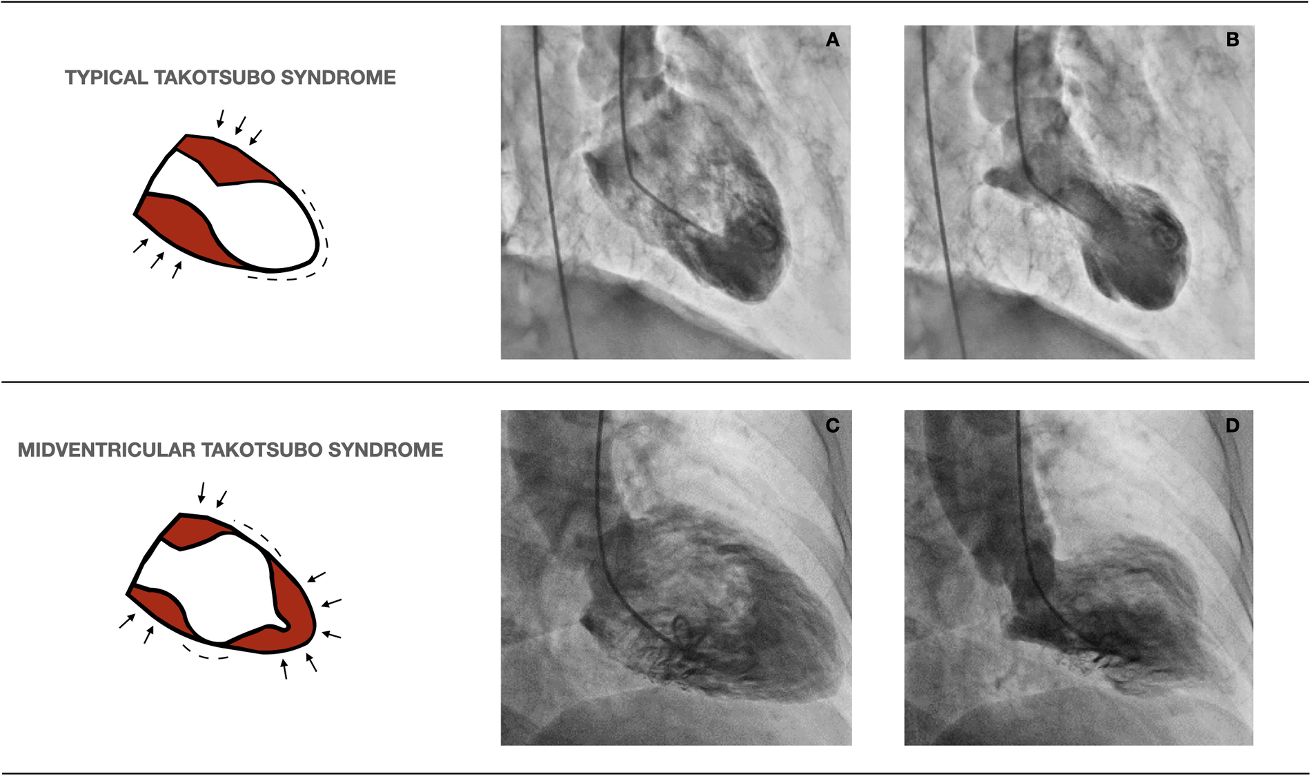 Left ventriculography images of representative cases of typical TTS and MV-TTS. The diagrams on the left illustrate normokinetic or hyperkinetic segments (arrows) and akinetic segments (dashes). (A) (end-diastole) and (B) (end-systole) exemplify typical TTS, while (C) (end-diastole) and (D) (end-systole) characterize MV-TTS. TTS, takotsubo syndrome; MV-TTS, midventricular TTS.