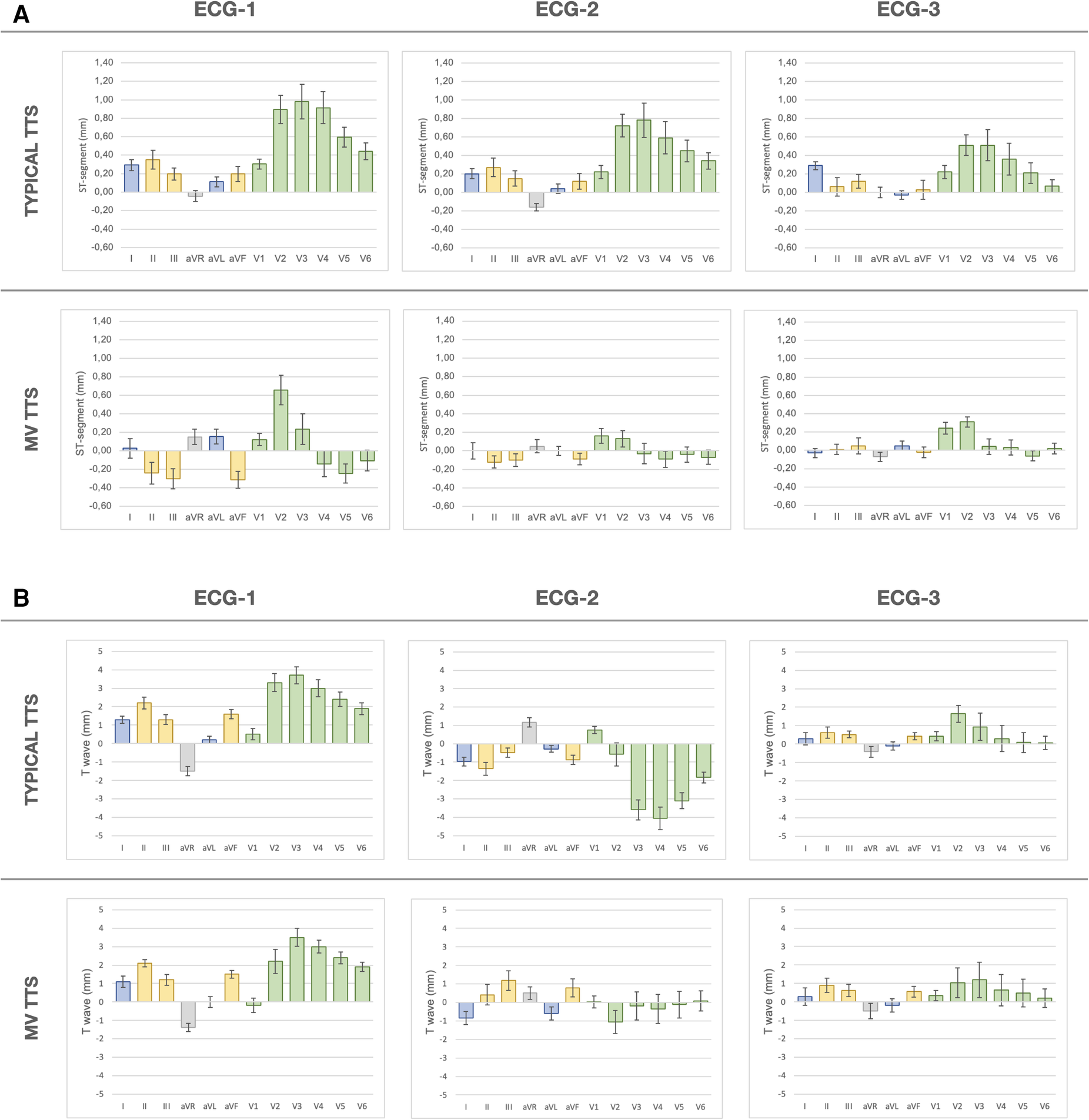 Table 2 summarizes ECG characteristics and Figure 3 illustrates ST-segment and T wave changes in ECG-1, ECG-2, and ECG-3 for the typical TTS compared to the MV-TTS.
