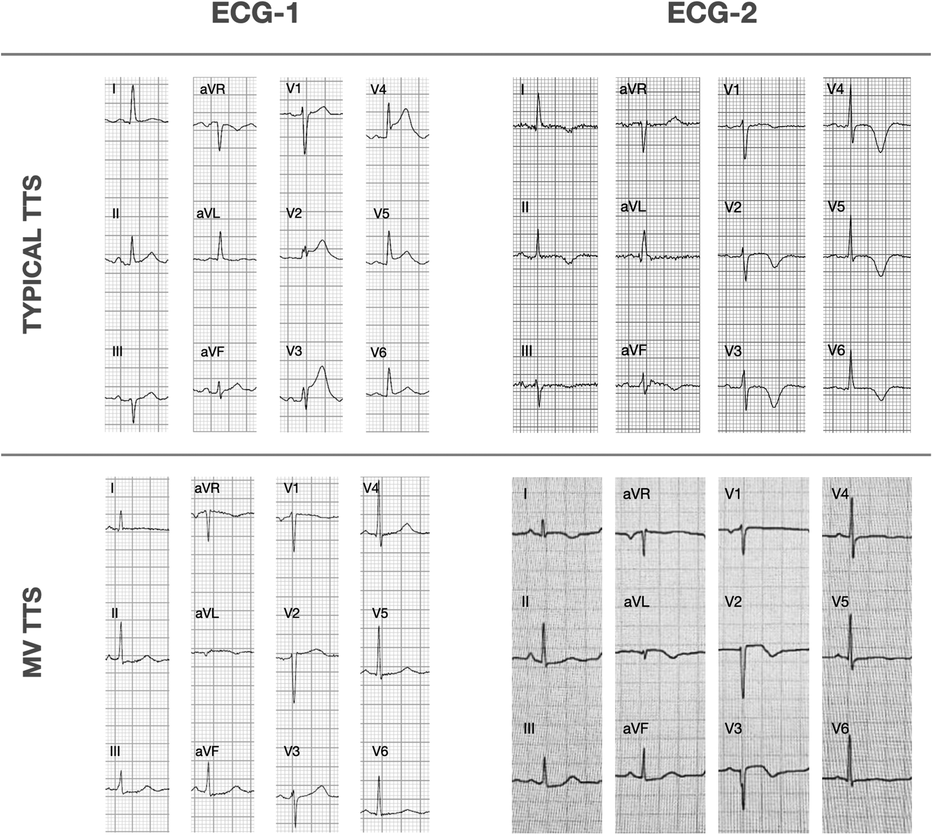 We therefore investigated whether MV-TTS is characterized by a pattern of ECG abnormalities different from typical TTS. This could potentially enhance clinical suspicion and facilitate early diagnosis of the specific clinical features profiling this emerging subgroup of patients.