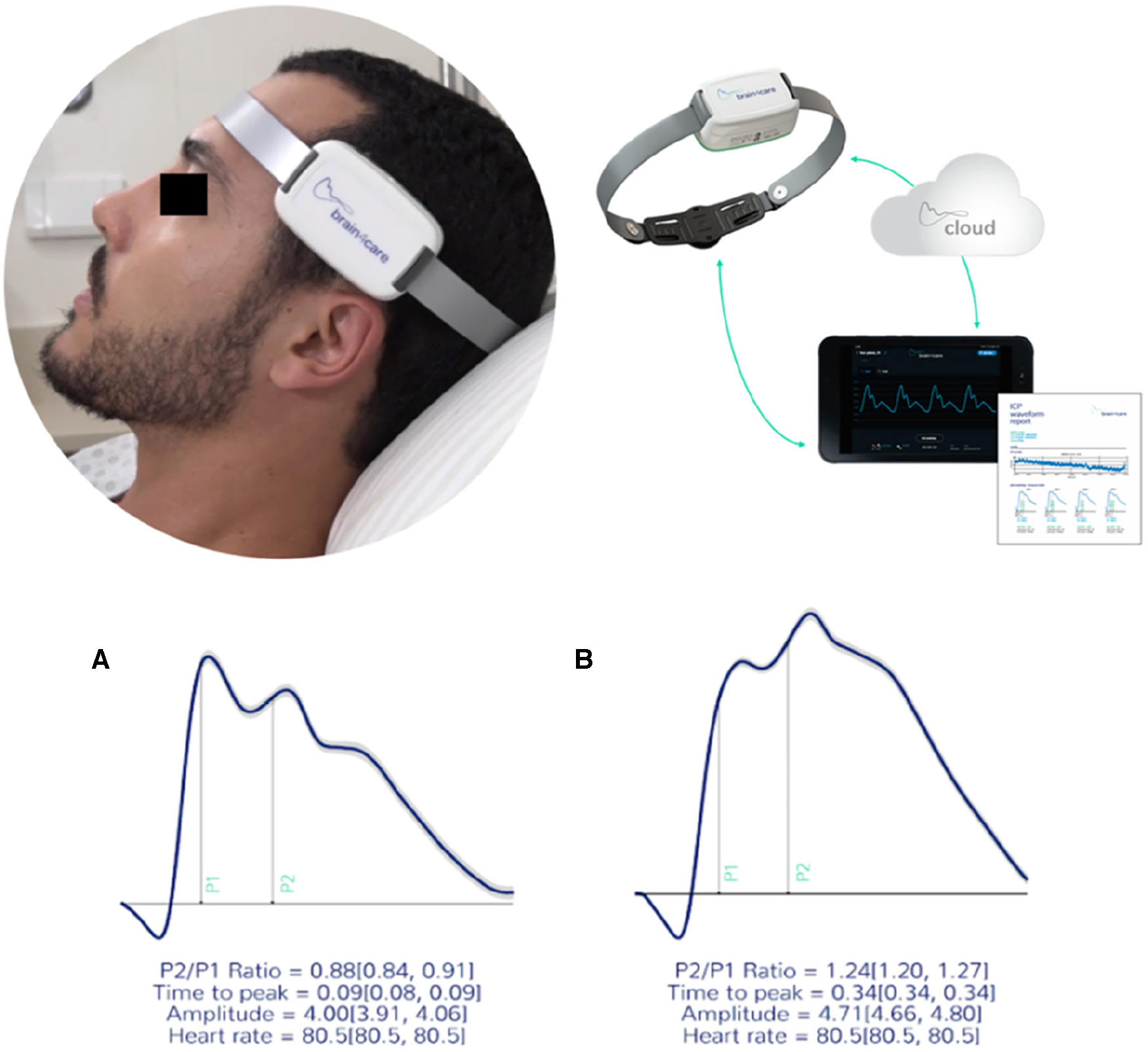 Figure 2. The b4c noninvasively ICP waveform real time monitoring. All data collected is immediately processed by the b4c system analytical software resulting in the quantitative and qualitative reports. (A) waveforms depicting normal standards (P2/P1 < 1.2 and TTT < 0.25 seg) and (B) altered standards (P2/P1 ≥ 1.2 and TTP ≥ 0.25 seg). (6).