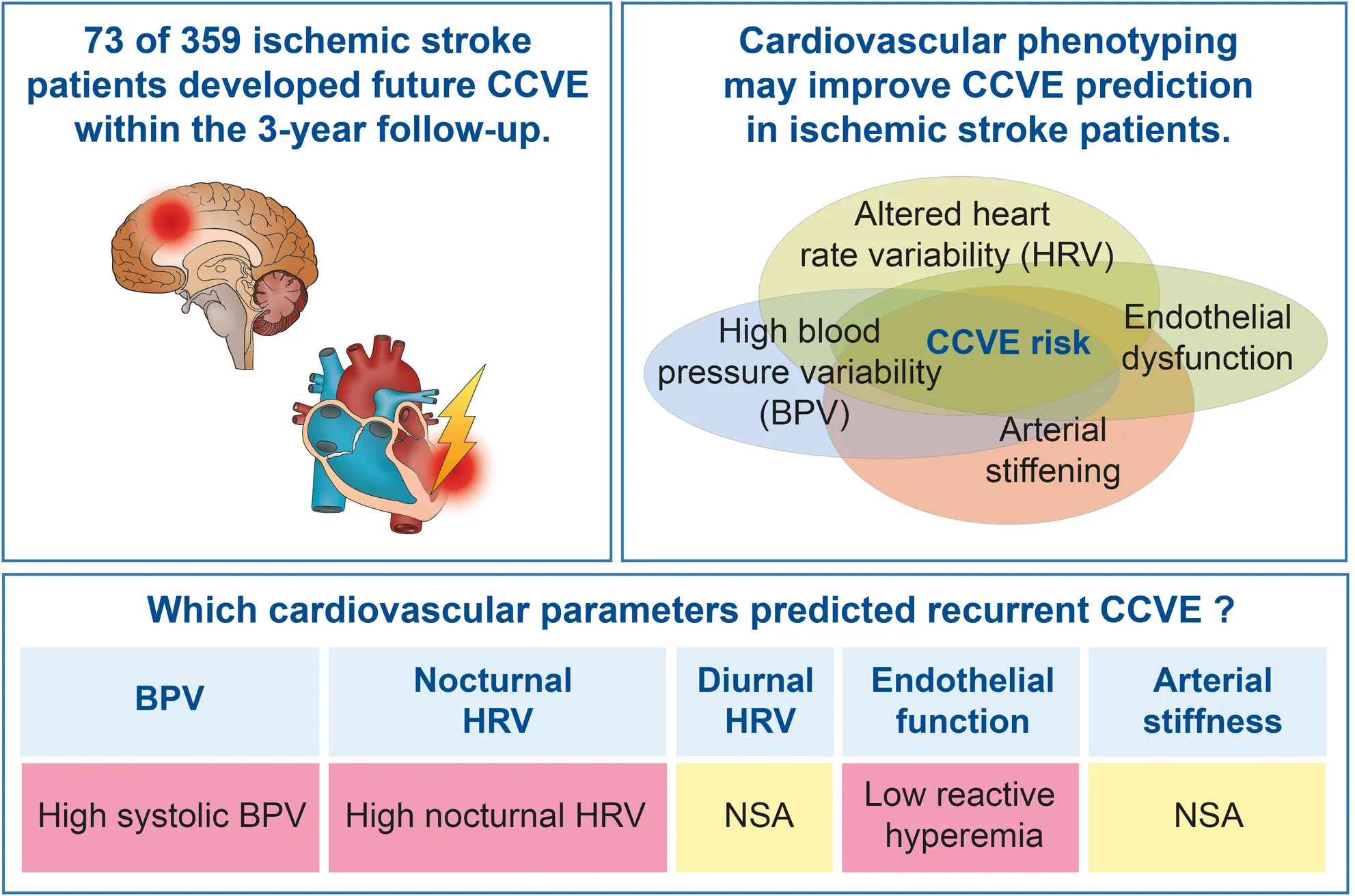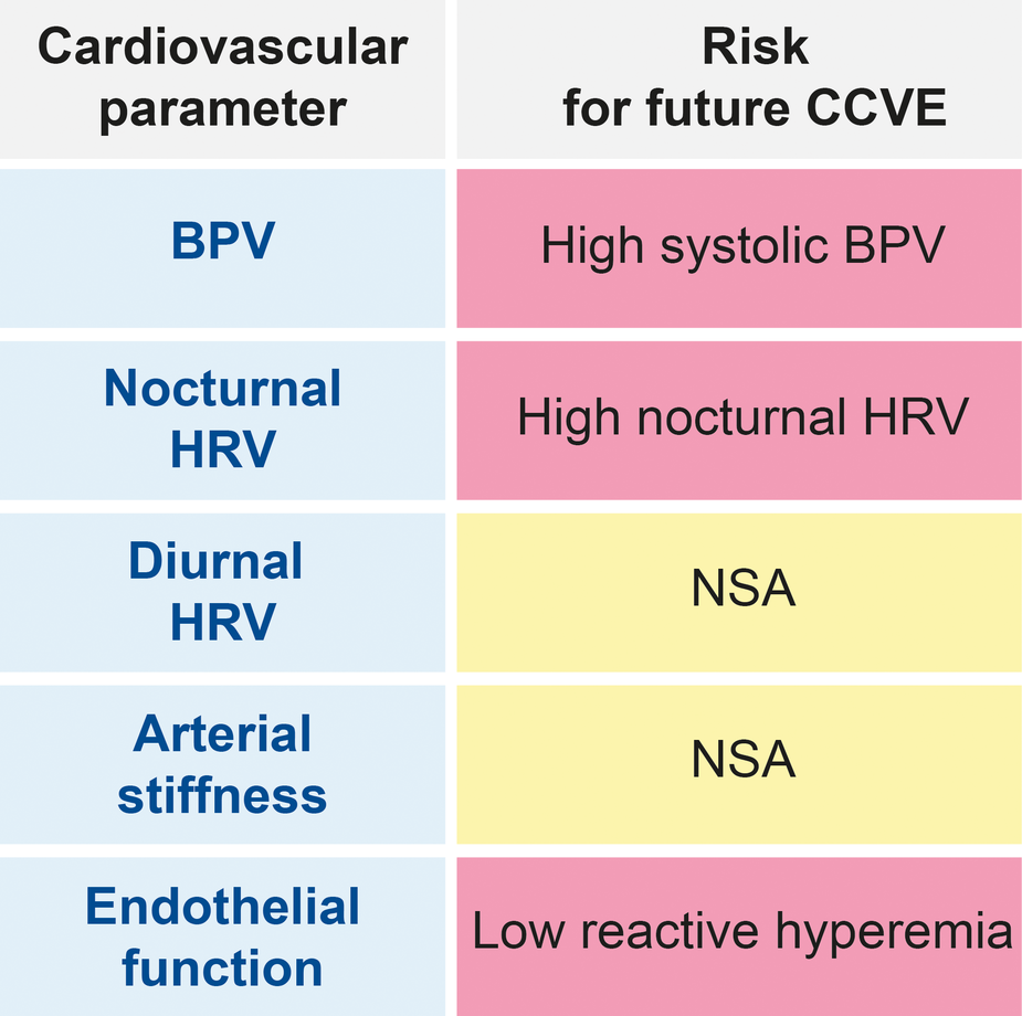 High blood pressure variability, high nocturnal HRV and endothelial function contribute to the risk for future CCVE after stroke.