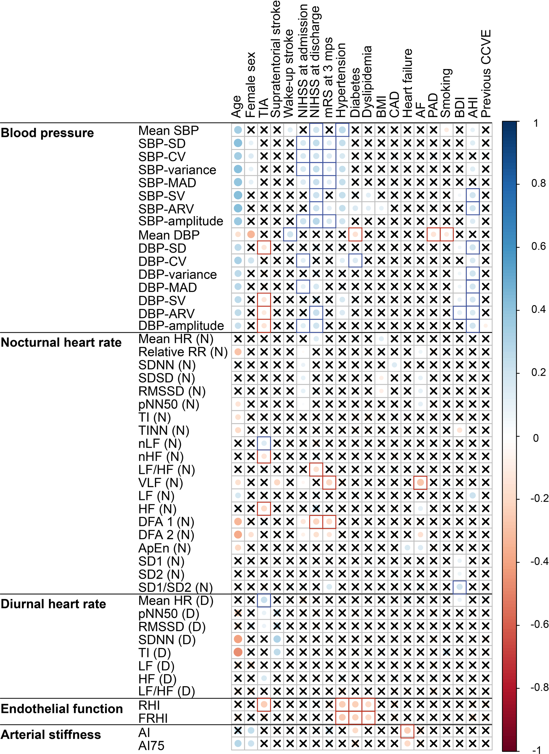 Correlation plot of the associations of cardiovascular parameters recorded at acute stroke with demographics, stroke characteristics and cardiovascular risk factors. Significant (p < 0.05) associations according to Spearman correlation test are shown as filled circles. Crosses mark the insignificant (p ≥ 0.05) associations. Blank squares mark the associations that remained significant in multiple regression models after adjustment for age and sex. The abbreviations for cardiovascular parameters are specified in the abbreviation list. AF, atrial fibrillation; bpm, beats per minute; BDI, Beck Depression Inventory; BMI, body mass index; CAD, coronary artery disease; TIA, transient ischemic attack.