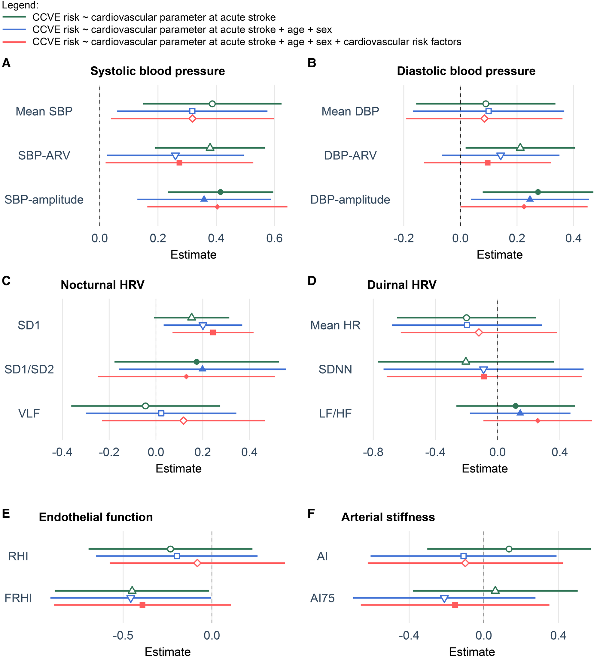 ApEn, approximate entropy; AI, augmentation index; AI75, augmentation index normalized for 75 bpm; AIC, Akaike Information Criterion; ARV, average real variability; AS, arterial stiffness; BPV, blood pressure variability; CCVE, cerebro-cardiovascular events; CV, coefficient of variation; D, diurnal; DBP, diastolic blood pressure; DFA1, detrended fluctuation analysis component α1; DFA2, detrended fluctuation analysis component α2; EF, endothelial function; FRHI, Framingham Reactive Hyperemia Index; HFnu, normalized high frequency power; HF, high frequency power; HR, heart rate; HRV, heart rate variability; LFnu, normalized low frequency power; HFnu, normalized high frequency power; LF, low frequency power; MAD, mean absolute deviation; mps, months post-stroke; N, nocturnal; pNN50, percentage of adjacent NN intervals that differ from each other by more than 50 ms; RHI, reactive hyperemia index; RMSSD, root mean square of successive differences of successive RR intervals; SBP, systolic blood pressure; SD, standard deviation; SD1, SD1 from Poincaré plot; SD2, SD2 from Poincaré plot; SDNN, standard deviation of normal-to-normal beats; SDSD, standard deviation of successive RR interval differences; SV, successive variation; TI, triangular index; TIA, transient ischemic attack; TINN, triangular interpolation of NN interval histogram; VLF, very low frequency power.