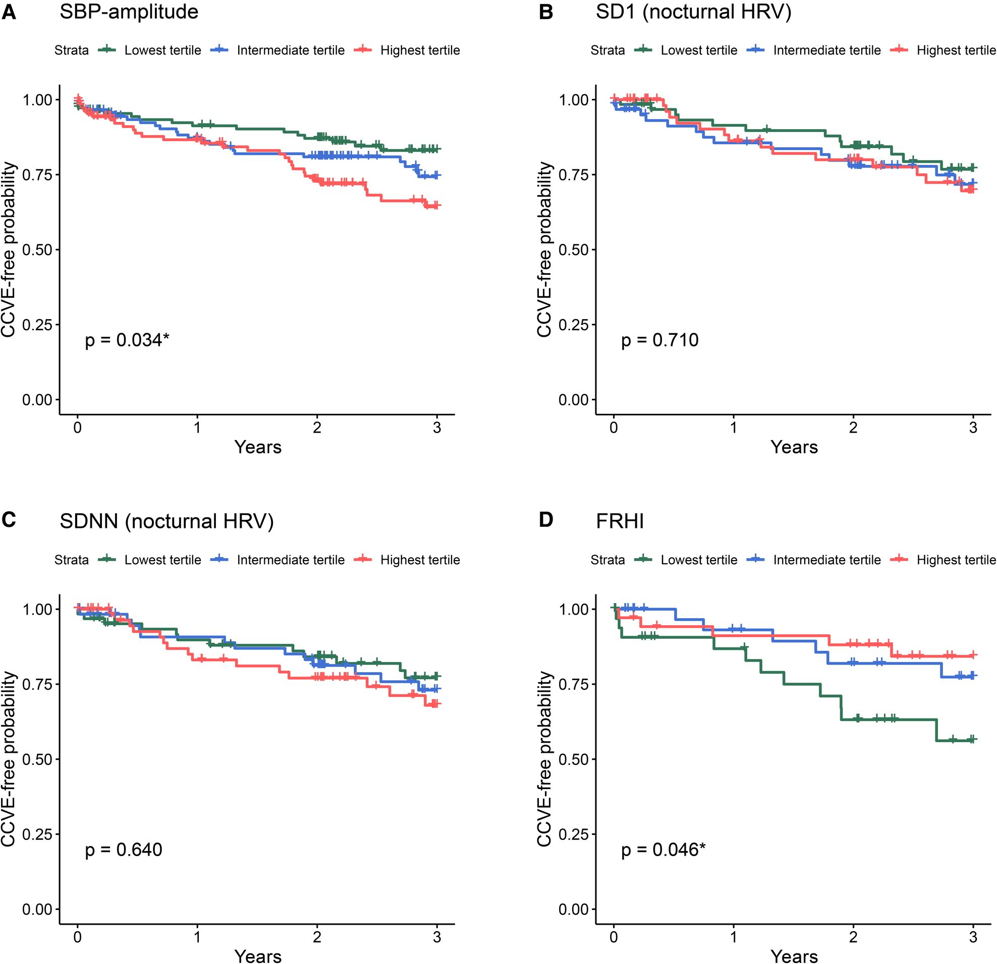 We performed a descriptive analysis, and, following inspection of the distribution of continuous variables, we log-transformed non-normally distributed variables (rrHRV, SDNN, SDSD, RMSSD, pNN50). We then used Spearman's rank correlation to investigate the associations between continuous variables: cardiovascular parameters, demographics, stroke characteristics and cardiovascular risk factors. The significant associations according to correlation analysis were further investigated using multiple linear regression adjusted for age and sex. Finally, we investigated the associations between cardiovascular parameters and future CCVE within 3 years post-stroke using univariate and multiple Cox regression models. We consecutively adjusted multiple Cox regression models as follows: (1) age + sex; (2) age + sex + cardiovascular risk factors. To delineate the potential impact of mean on variability (17), multiple Cox regression models that included systolic BPV, diastolic BPV, nocturnal HRV or diurnal HRV as independent variables were additionally adjusted for mean SBP, mean DBP, mean nocturnal HR or mean diurnal HR, respectively.