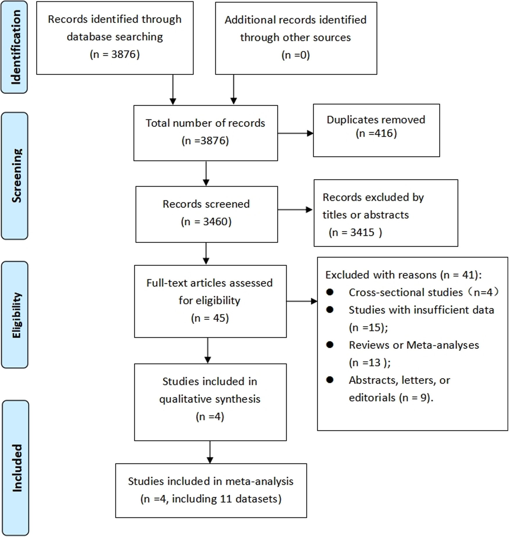 Following a computer system search, 3,876 records were revealed, with duplicates removed, resulting in 3,460 records. After further evaluation of the full text of 45 studies, four cohort studies (21–24) (eleven datasets) were found to fulfill the criteria (the reason for the exclusion of 41 articles was provided Supplementary Table S2) and thus included in this meta-analysis. As shown in Figure 1, the PRISMA flowchart illustrates the process of research selection.