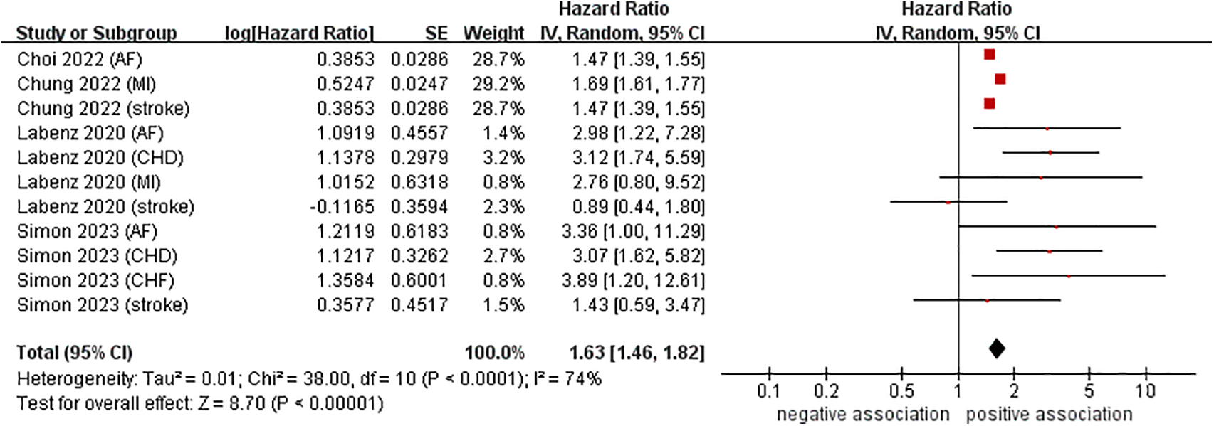 | Labenz (21) (MI) | 1.62 (1.45–1.81) | <0.00001 | I2 = 76%, P < 0.0001 |