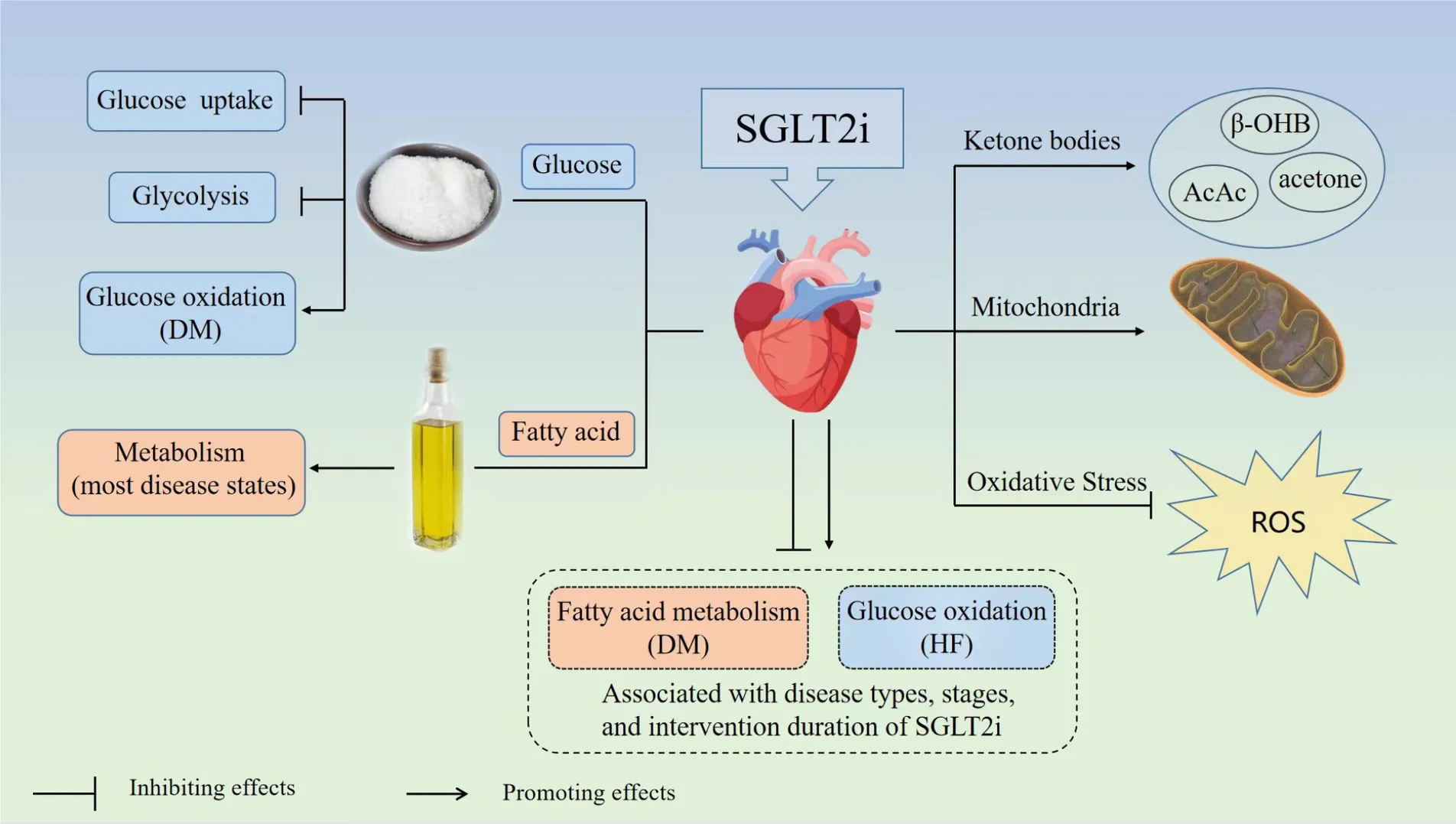 The results of the 34 included studies (including 10 clinical and 24 animal studies) showed that SGLT2i inhibited cardiac glucose uptake and glycolysis, but promoted fatty acid (FA) metabolism in most disease states. SGLT2i upregulated ketone metabolism, improved the structure and functions of myocardial mitochondria, alleviated oxidative stress of cardiomyocytes in all literatures. SGLT2i increased cardiac glucose oxidation in diabetes mellitus (DM) and cardiac FA metabolism in heart failure (HF). However, the regulatory effects of SGLT2i on cardiac FA metabolism in DM and cardiac glucose oxidation in HF varied with disease types, stages, and intervention duration of SGLT2i.
