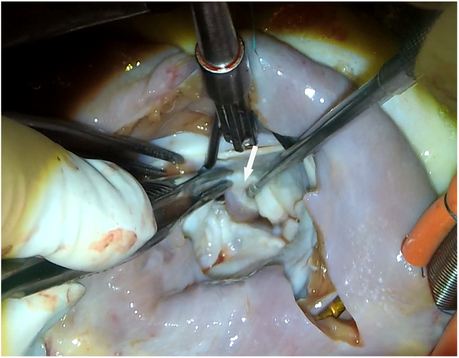 View of anomalous papillary muscles (arrow) directly inserted into the anterior mitral valve.