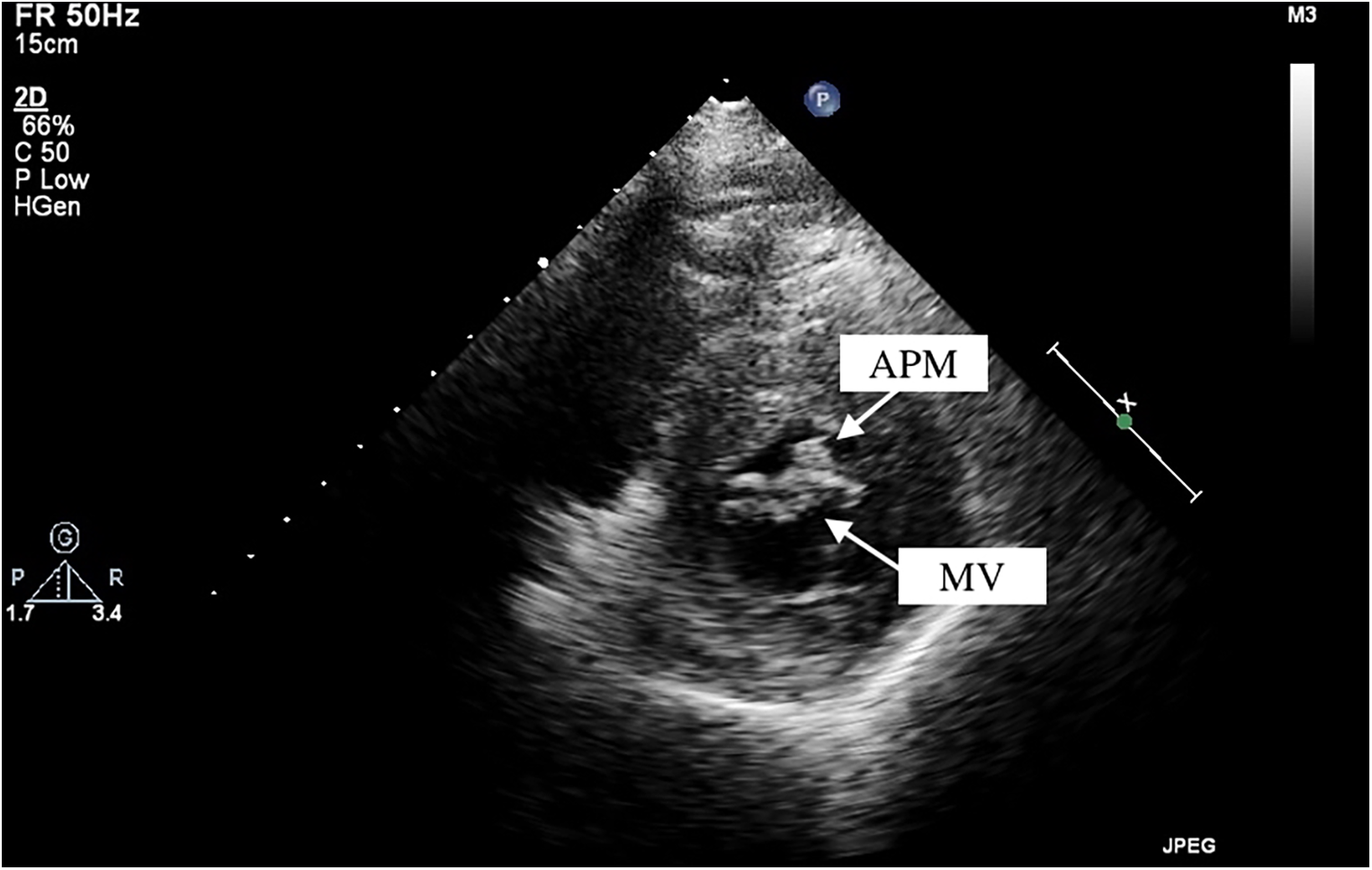 Anomalous papillary muscle (upper arrow) insertion into the mitral valve (lower arrow) visualized by transthoracic echocardiography. APM, anomalous papillary muscle; MV, mitral valve.