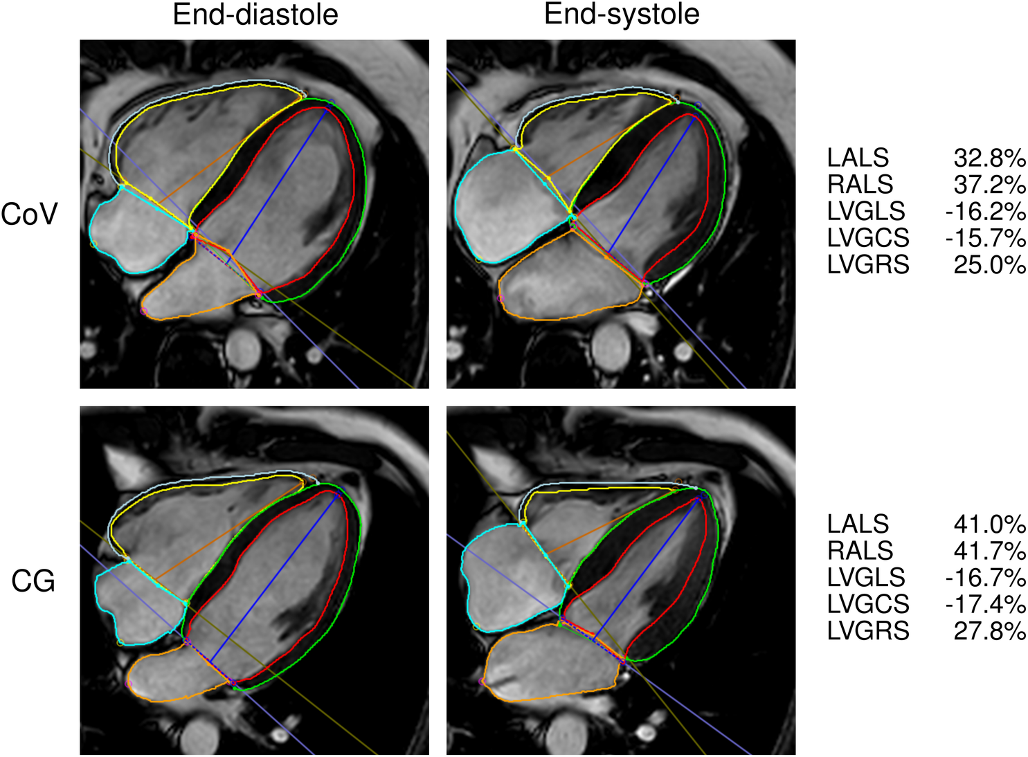 Contouring for the ventricular and atrial strain calculation in one patient who recovered from COVID-19 (CoV) and one control (CG). GCS, global circumferential strain; GLS, global longitudinal strain; GRS, global radial strain; LA, left atrium; LS, longitudinal strain; LV, left ventricle; RA, right atrium; RV, right ventricle.