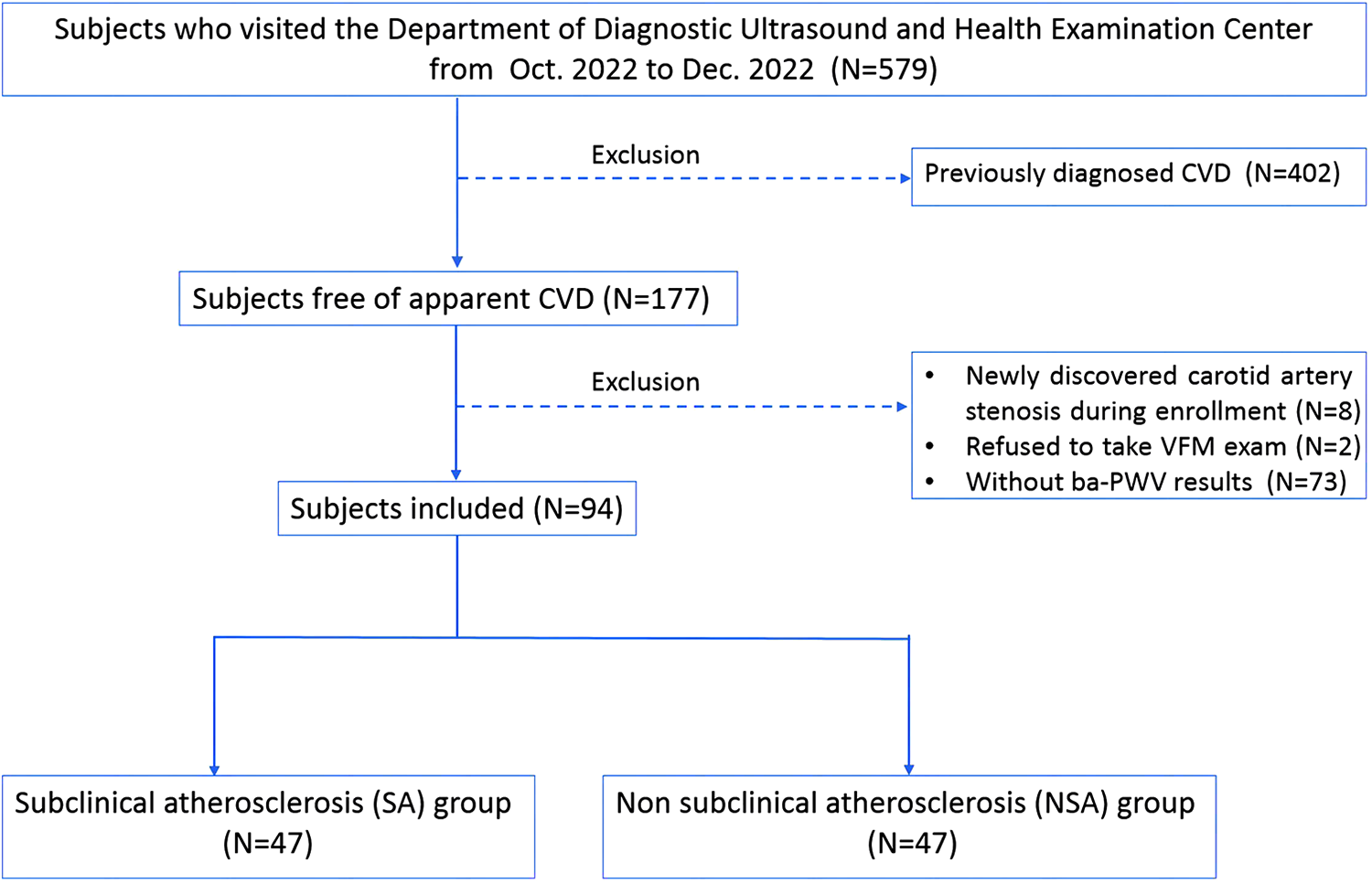Subjects with newly discovered carotid artery stenosis during enrollment were excluded (N = 8) (17). Subjects who refused to take VFM examination were excluded (N = 2). Subjects who did not participate in ba-PWV examinations were excluded (N = 73). We finally enrolled 94 subjects for analysis. All subjects included received routine physical examinations, medical history collection, blood biochemical examinations, regular ultrasounds, and VFM examinations. Ba-PWV and 24-hour ambulatory blood pressure monitoring were also performed. Average Ba-PWV combining bilateral values was used for data analysis. The China-PAR score was used to present the 10-year CVD risk of the subjects. Risk classification criteria were defined as: low risk (<5%), medium risk (5%–9.9%), or high risk (≥10%) (18).