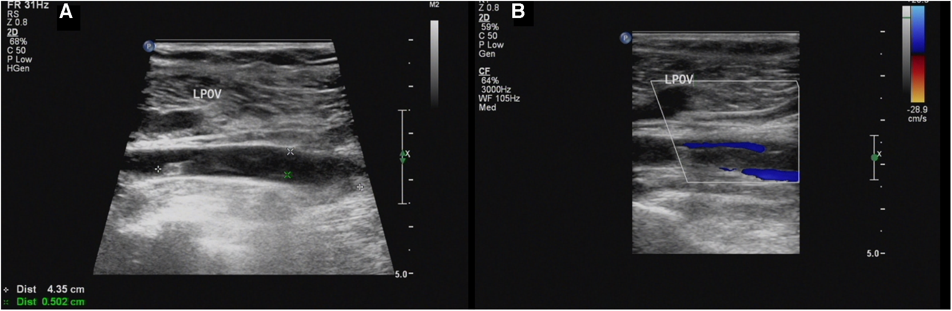 Figure 1. (A,B) Sagittal sonogram and sagittal color Doppler US limb of thrombosis of the left popliteal vein (LPOV).