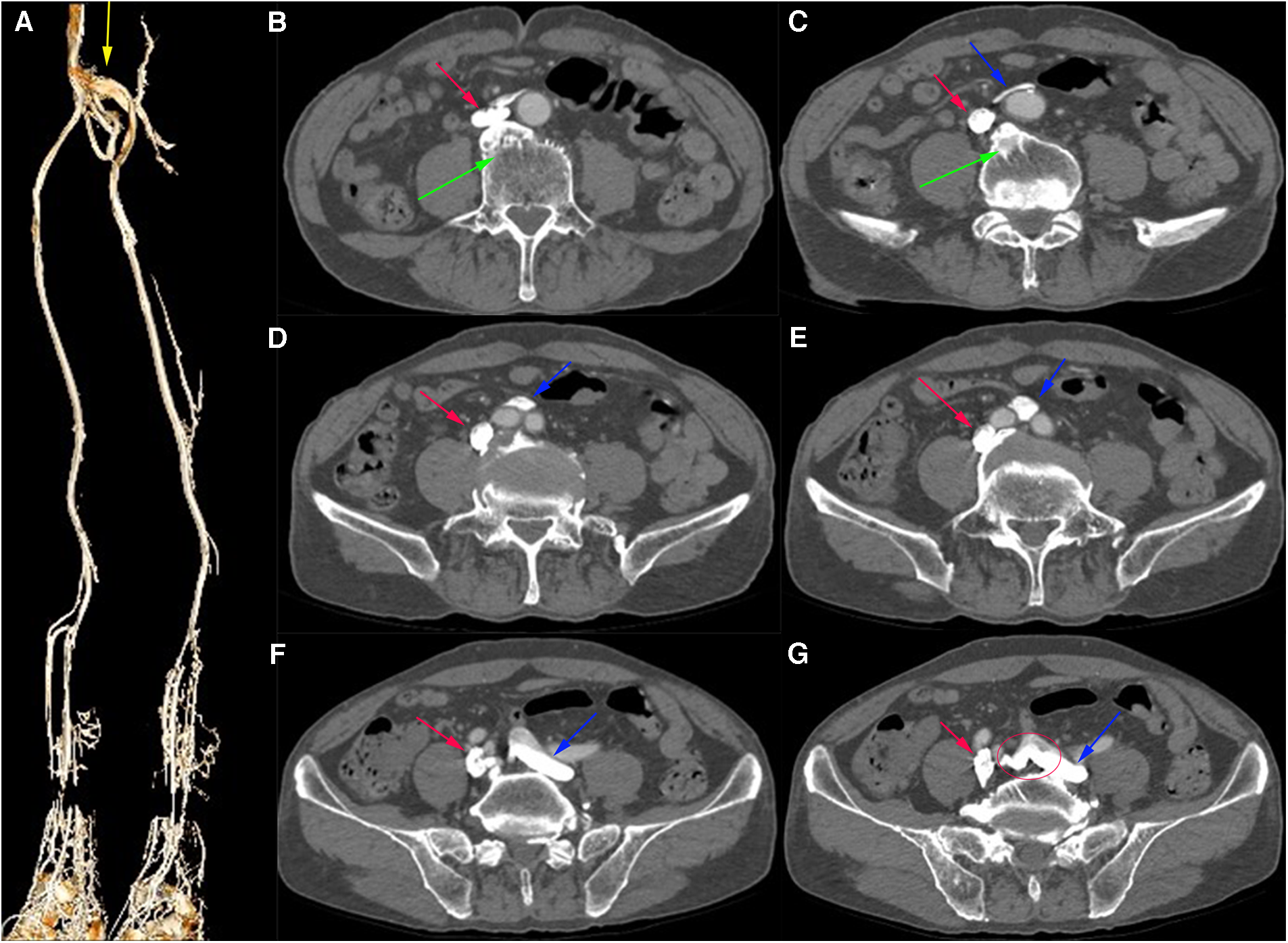 Figure 2. (A) Virtual Reality (VR) image of the patient's pre-intervention CTV of lower limb, with anastomosing branches seen between the iliac veins bilaterally. (B–G) Axial venous phase image, with osteophytes seen (green arrows) and the left common iliac vein (blue arrow) bypassing the abdominal aorta ventrally and traveling dorsally from between the right and left common iliac arteries, with anastomosing branches seen between the common iliac veins.