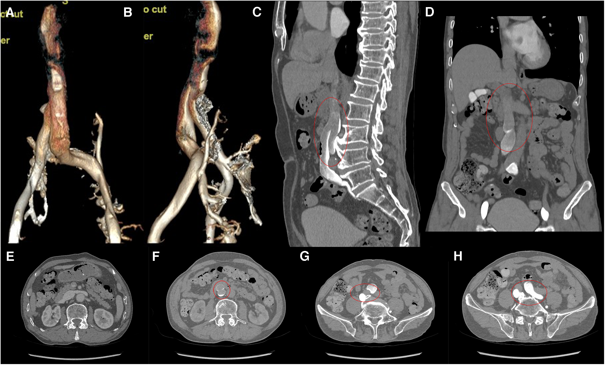 Figure 3. (A,B) VR images of CTV of IVC. (C,D) MPR images of the sagittal and coronal venous phases of IVC, showing DIVC in a ventral-dorsal relationship (red oval), confluent at the level of 3rd lumbar vertebra. (E) Plain scan, with normal development of the bilateral renal veins where they converge into IVC. (F–H) Images of the axial venous phase, with the inferior renal segment of the IVC divided into two ventral and dorsal branches. The left common iliac vein crosses between the bilateral common iliac arteries to join the ventral vessel, and the right common iliac vein joins the dorsal vessel.