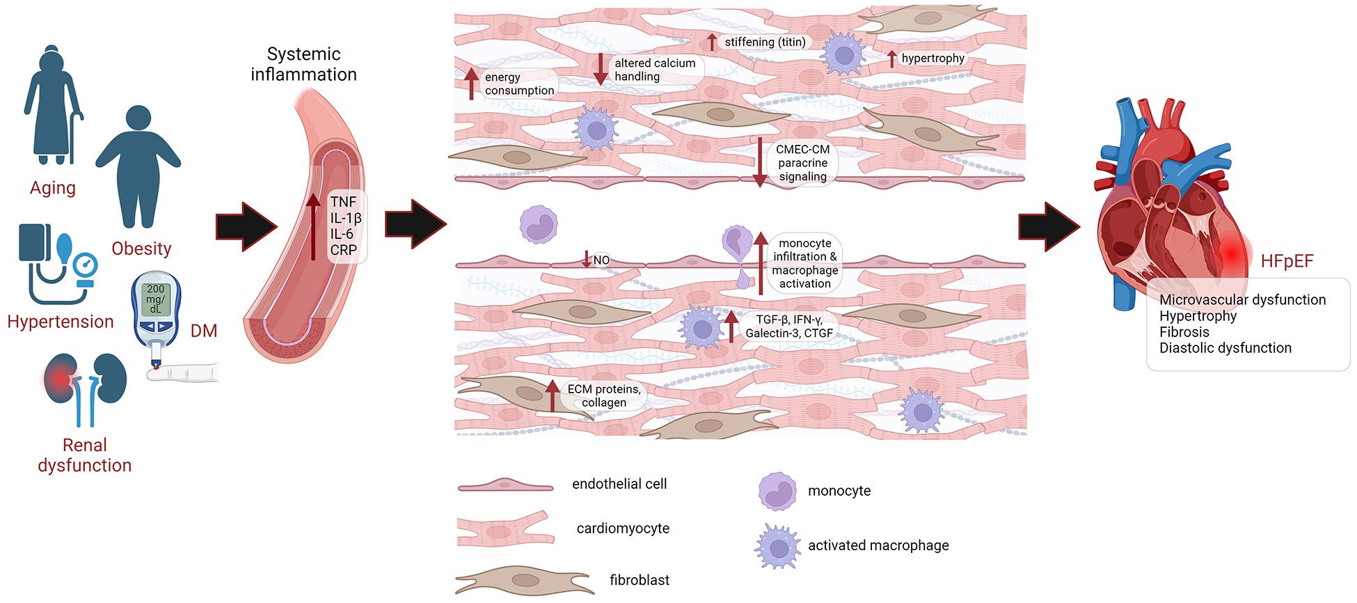 Pathophysiology of HFpEF. HFpEF patients are older, mostly female, and exhibit a higher burden of non-cardiac comorbidities, such as DM, obesity, hypertension and renal dysfunction. These comorbidities lead to systemic inflammation, causing microvascular damage. This drives endothelial dysfunction, leading to reduced NO levels, higher infiltration of monocytes and activation of cardiac resident macrophages, which express profibrotic factors TGFβ, IFNγ, Galectin-3 and CTGF, leading to proliferation and activation of cardiac fibroblasts, promoting the deposition of ECM proteins and collagen. Endothelial dysfunction also impairs paracrine signaling of CMECs to cardiomyocytes. Cardiomyocyte remodeling is also evident from cardiomyocyte hypertrophy, altered calcium handling, increased energy consumption and increased passive stiffness. Eventually, this leads to diastolic dysfunction and HFpEF. DM, diabetes mellitus; CRP, C-reactive protein; CMEC, cardiac microvascular endothelial cell; CM, cardiomyocyte; ECM, extracellular matrix; NO, nitric oxide; HFpEF, heart failure with preserved ejection fraction.