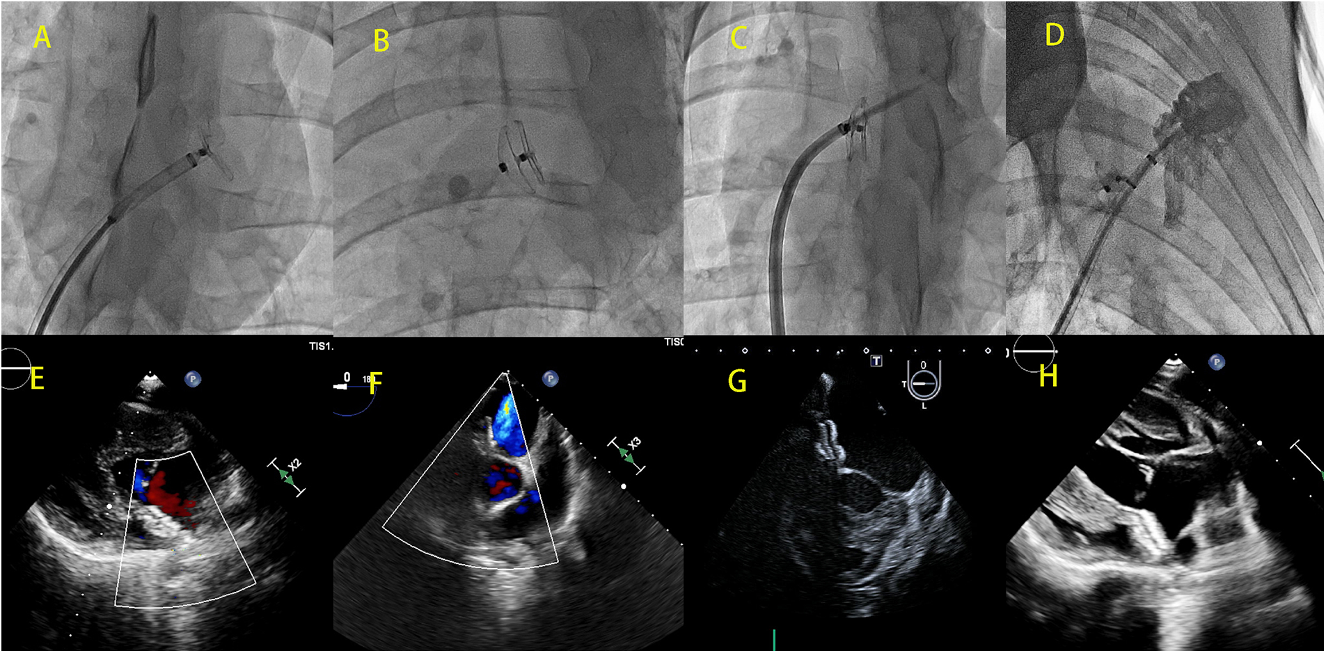 DSA images (A–D) and cardiac ultrasound images (E–H) showing the implantation of a bilateral asymmetric single-rivet PFO occluder device in the reserved interatrial septum puncture area. (A) Left ventricular disc of the deployed occluder device; (B) morphology of the fully deployed occluder device; (C) successful puncture of the interatrial septum through the puncture site reserved by the occluder device after 3 months of initial implantation; (D) left atrial angiography performed through the sheath inserted via the interatrial septum; (E,F) no residual shunting observed immediately after the implantation of the occluder device; (G,H) cardiac ultrasound demonstrating the morphology of the occluder device after implantation.