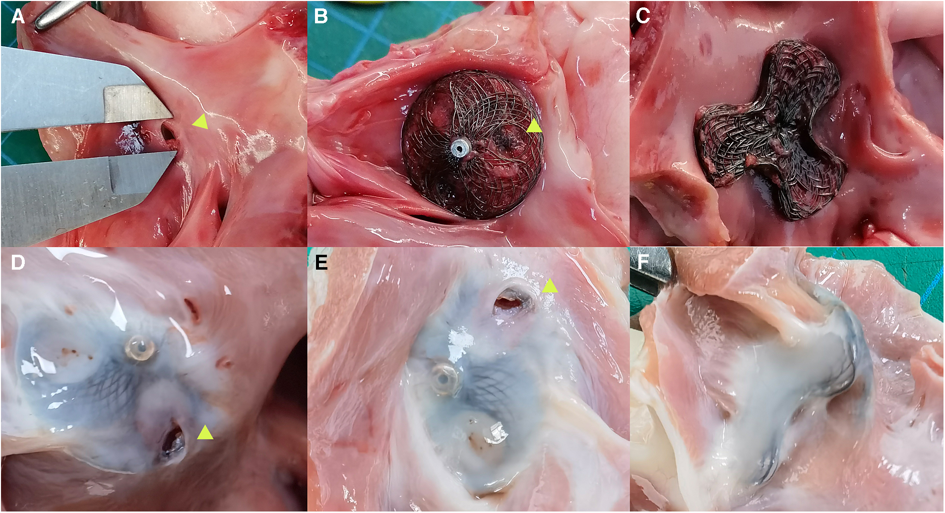 Anatomy specimens of bilateral asymmetrical single-rivet PFO occluder implanted in the reserved area of the interatrial septum. (A) Artificial PFO; (B) anatomy specimen of the occluder immediately after interatrial septal puncture, shown as a right atrial side view plate with an arrow indicating the interatrial septal puncture hole; (C) left atrial side view plate of the occluder immediately after implantation, closely attached to the interatrial septum; (D,E) anatomy specimens of the occluder taken 3 months after implantation and subsequent interatrial septal puncture, shown as right atrial side view plates with a gray-white surface covering the internal membrane, with an arrow indicating the interatrial septal puncture hole; (F) anatomy specimen of the occluder taken 3 months after implantation, shown as a left atrial side view plate with a completely covered internal membrane surface.