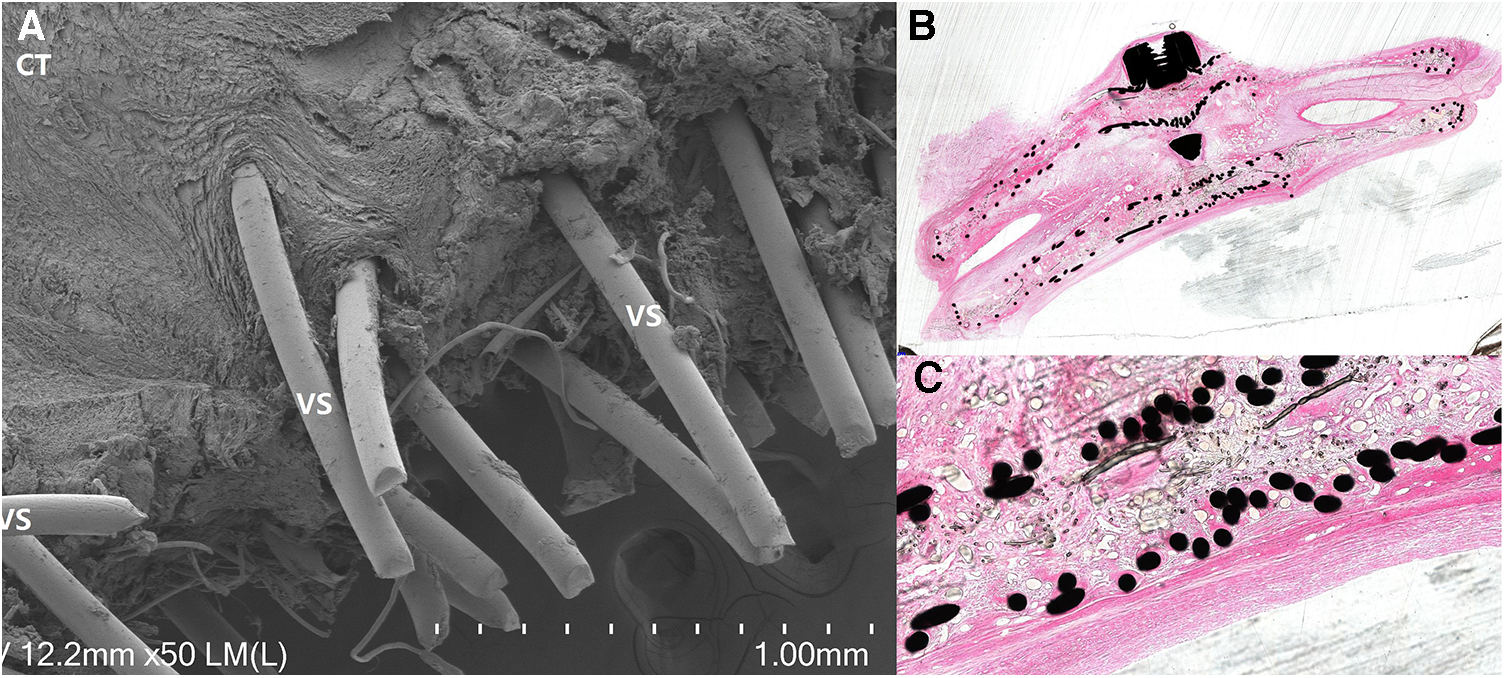 Pathological and electron microscopy specimens: (A) electron microscopy specimen revealed the presence of surrounding tissue covering the nitinol wire, with a significant amount of connective tissue (CT) filling the material gaps or surrounding it, demonstrating a tight structure. (B) Cross-sectional diamond knife slices demonstrated a well-preserved and structurally intact occluder, with the nitinol wire completely covered by connective tissue and fully enveloped by connective tissue and endothelial layers. (C) Neatly arranged nitinol wires, enveloped by connective tissue, with a surface layer consisting of connective tissue and an endothelial layer, appearing smooth and even.